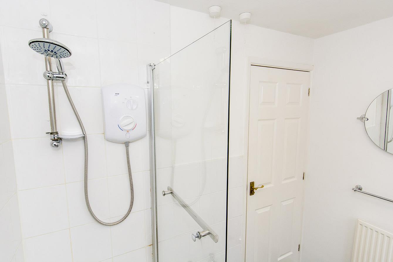 Bathroom - 1.70m" x 2.21m (5'7"" x 7'3") - Fitted with a low level WC. Pedestal wash hand basin. Bath with a Mira electric shower and side screen. Opaque glazed window to the side aspect. Ceramic wall and floor tiles. Central heating radiator.