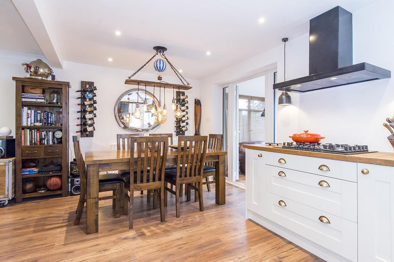 Open Plan Dining Kitchen & Utility - 6.58m x 2.77m (21'7 x 9'1) - This is the heart of the home and the open-plan element that has been created is simply stunning. The kitchen is fitted with high quality cream painted cabinets with solid oak surfaces. Porcelain bowl and half sink with mixer taps. Neff built- in double oven and a five burner gas hob with extractor canopy. Integral dishwasher and recycling bin system. Space for an American fridge freezer. Laminate flooring.