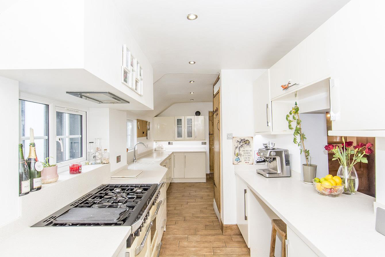 Breakfast Kitchen - 6.20m x 2.18m (20'4" x 7'2") - This magnificent breakfast kitchen is well suited to any keen home chefs. Fitted with cream cabinets with Corian work surfaces, undermounted bowl and a half sink with mixer taps , a Range cooker with a 5 burner hob with an extractor fan. The kitchen also benefits from a convenient breakfast bar with a seating area. There are two windows to the rear aspect and a composite door that leads to the garden. Ceramic tiles throughout. There is a door from the kitchen that access the garage.