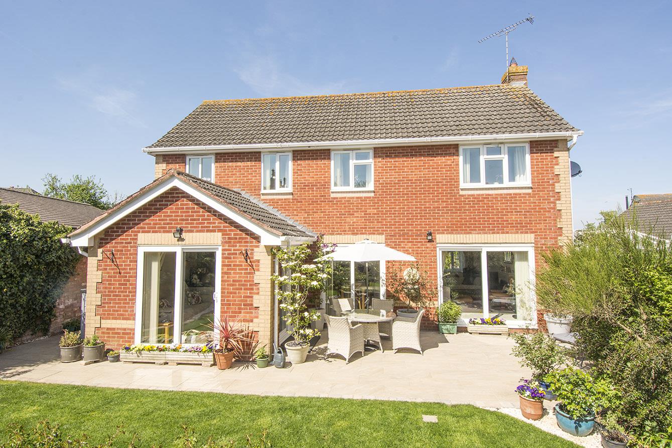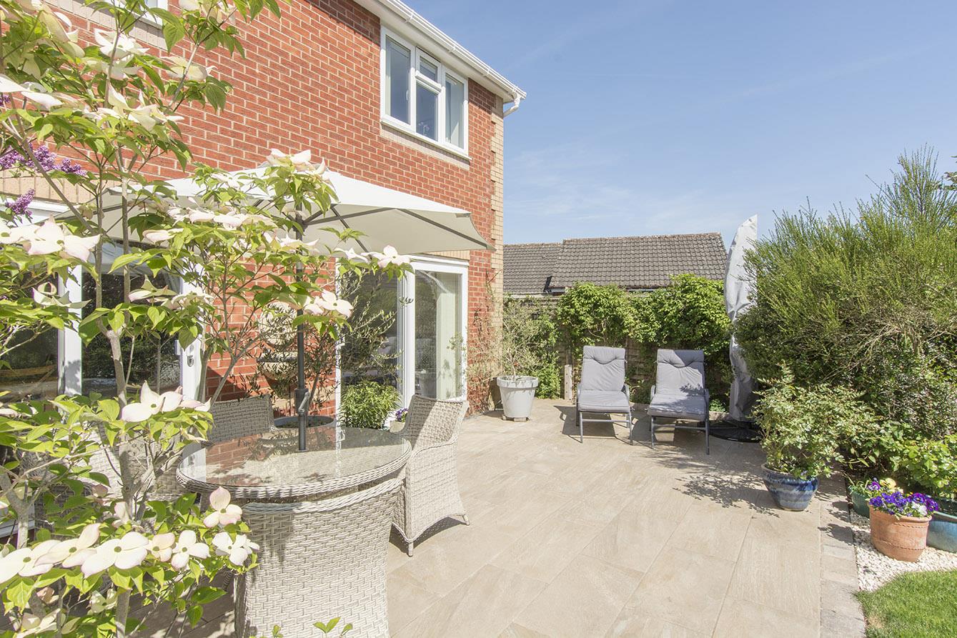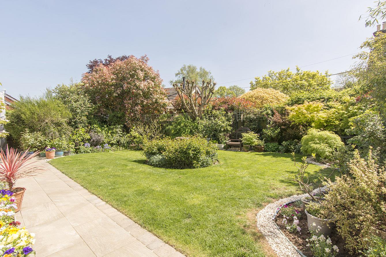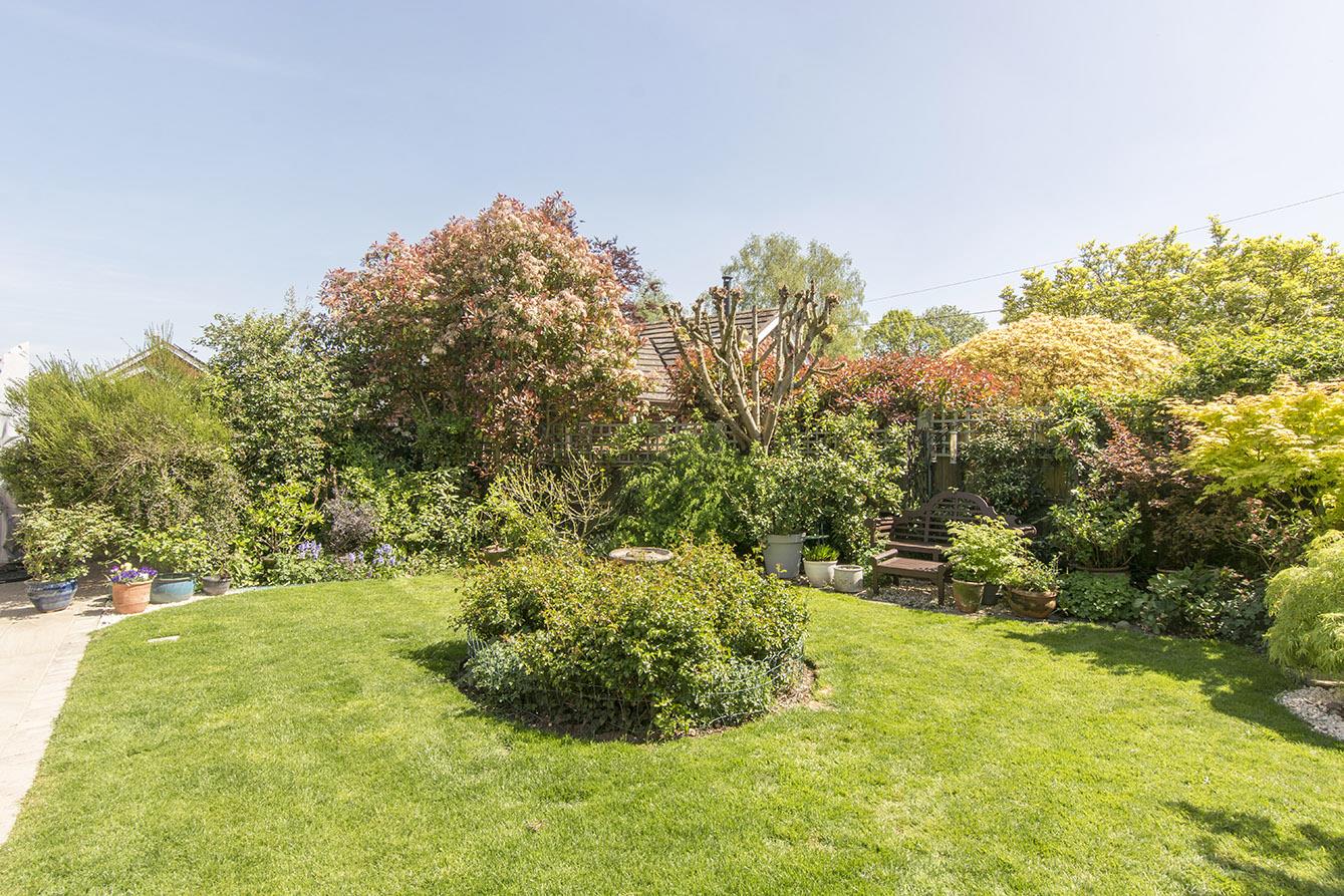 Garden - This beautiful garden is a private haven, enjoying plenty of sunshine and featuring a newly laid porcelain patio, a lush lawn, and well-stocked borders that add a touch of colour. For those with a green thumb, a vegetable plot with a greenhouse and timber shed is conveniently located to the side.