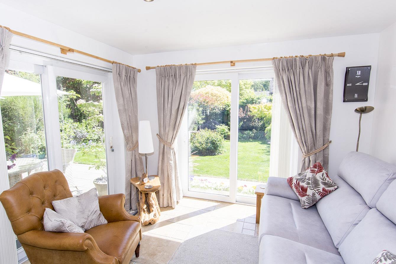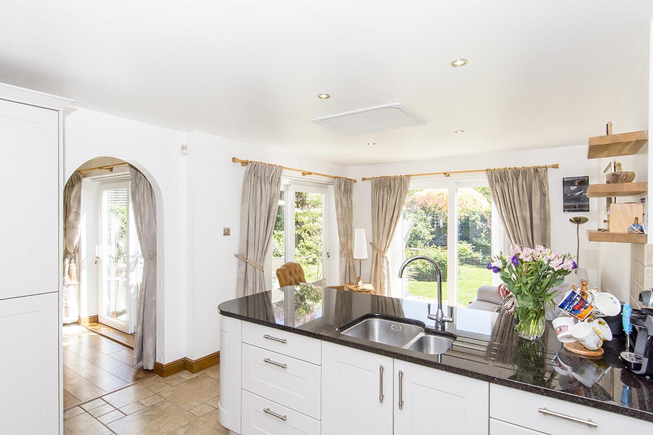 Kitchen & Family Room - 6.32m x 3.94m (20'9" x 12'11") - Fitted with new cabinet doors with granite surfaces. Stainless steel bowl and half undermounted sink with mixer taps. Range cooker with extractor canopy. space for an American fridge freezer. Ceramic tiled flooring. The kitchen opens into a lovely family seating area with dual aspect sliding patio doors both leading into the rear garden.