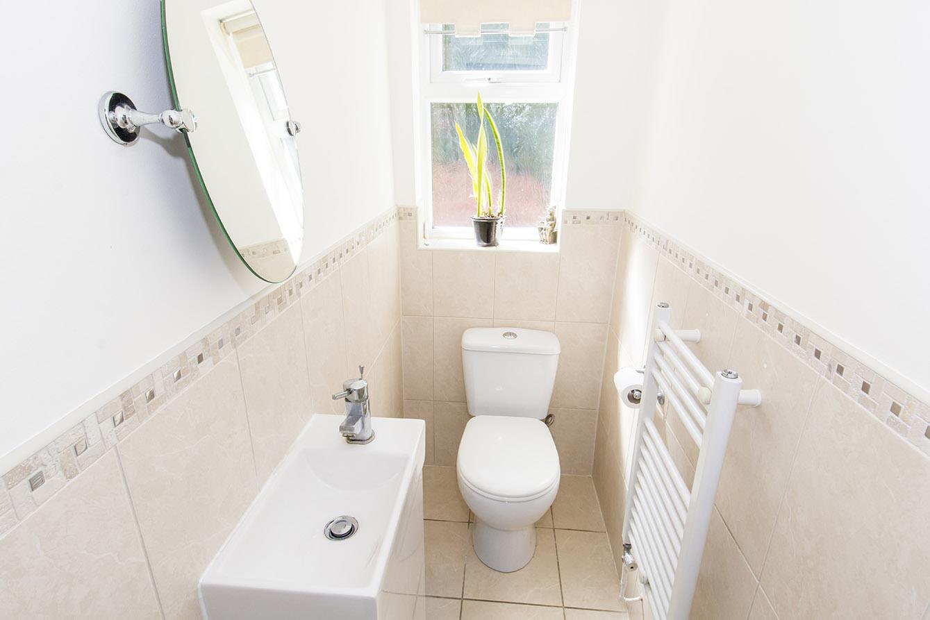 Cloakroom - Fitted with a low level WC. Hand wash basin set onto a vanity unit. Radiator. Ceramic wall and floor tiles. Opaque window to the side aspect.