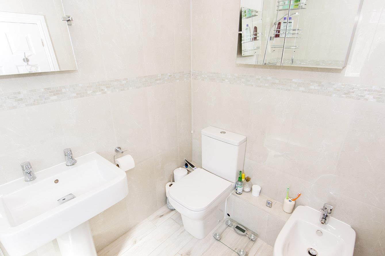En-Suite - Fitted with a low level WC. Bidet. Pedestal hand wash basin. Walk in shower with glass screen. Radiator. ceramic wall and floor tiles. Opaque window .