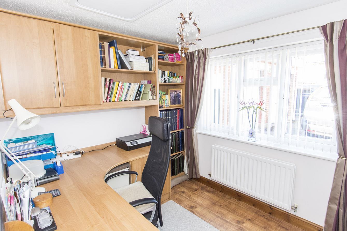 Study - 2.39m x 2.84m (7'10" x 9'4") - Fitted with an office desk and shelving. Wooden flooring. Window to the front aspect.