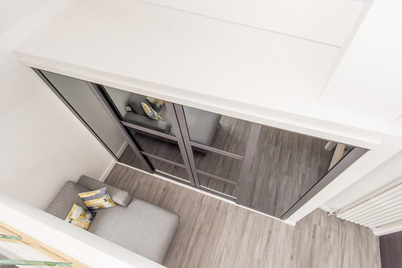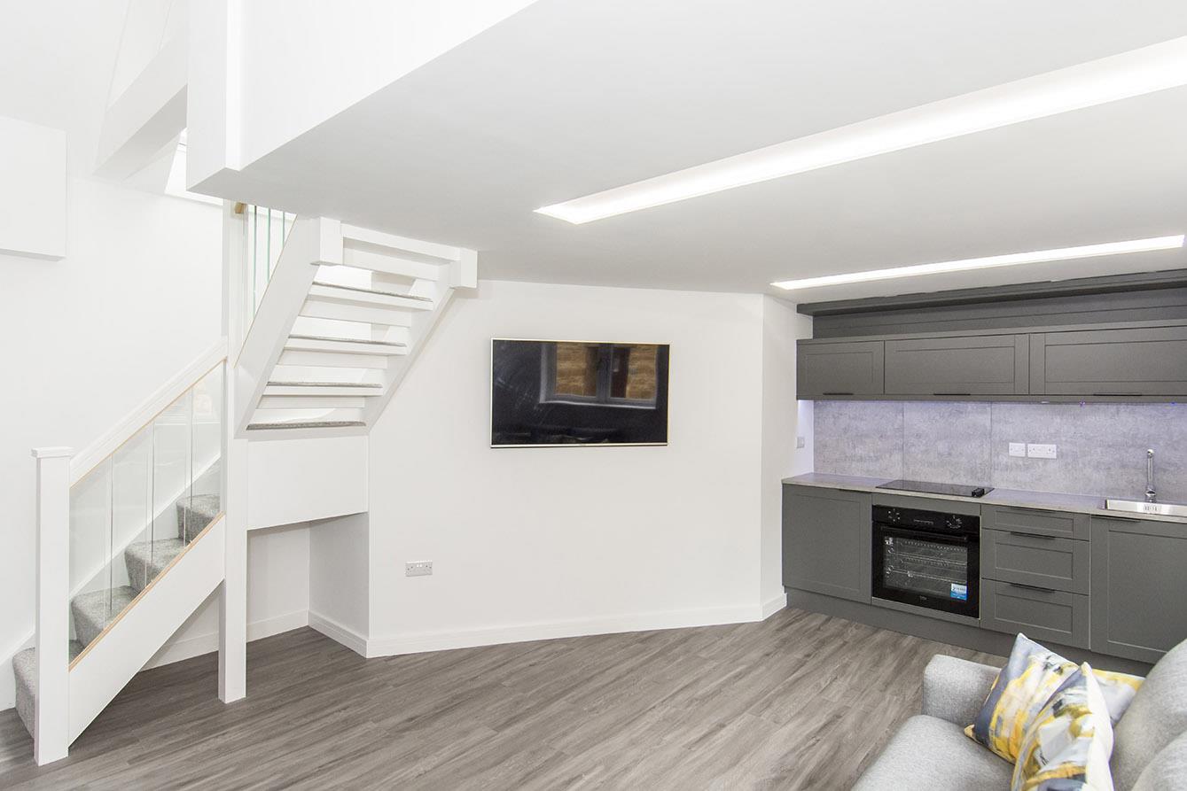 Mezzanine Bedroom - 4.29m with sloping ceilings x 3.96m to balustrade) - Two double-glazed sky lights. Smoke alarm to ceiling. Radiator. Stylish glass and timber balustrading overlooking void down to the living/dining/kitchen.