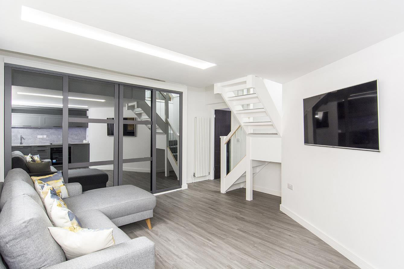 Living/Dining - UPVC double-glazed window. Vertical radiator. Set of mirrored cupboards also housing gas central heating boiler and a utility with space and plumbing for washing machine (appliance can be included within the sale). Luxury tiled vinyl flooring. Stairs rising into the first floor mezzanine with a stylish glass and timber balustrade.