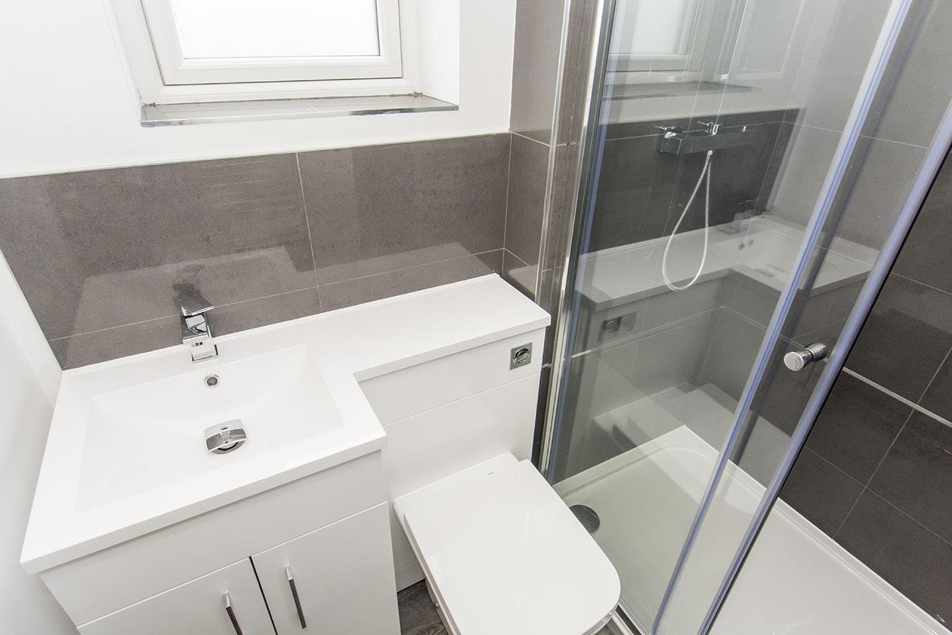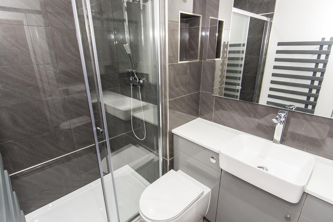 En-Suite - 1.91m x 1.32m (6'3" x 4'4") - Opaque UPVC double-glazed window to front. WC and wash hand basin inset to storage units. Double width shower cubicle with rain and flexible shower head. Inset LED strips to ceiling. Heated towel rail. Extractor fan. Luxury vinyl tiled flooring.