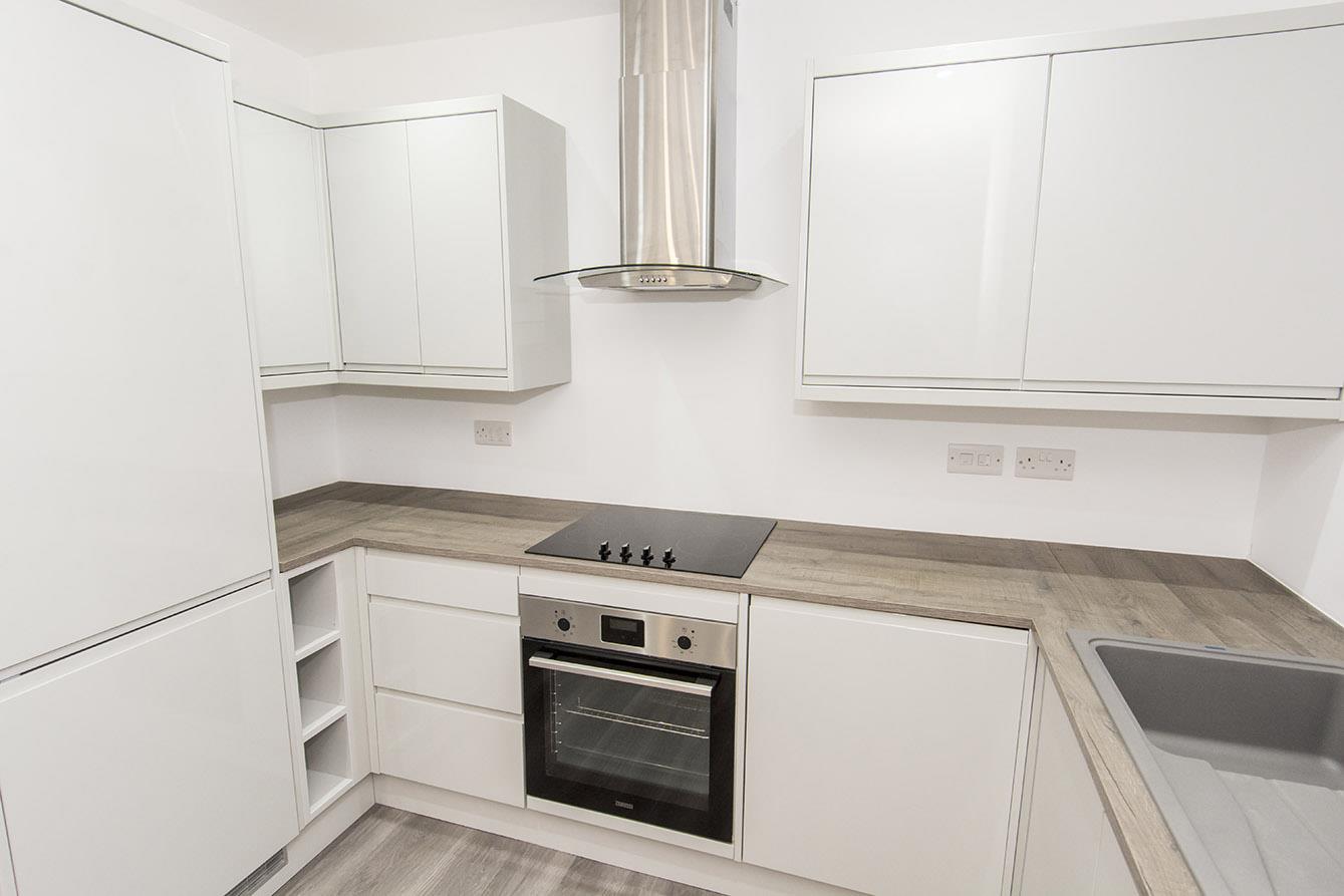 Kitchen Area - Fitted with a range of gloss faced wall and floor mounted units with worktops over. Stainless steel sink with mixer tap and drainer. Electric oven. Ceramic hob with extractor hood over. Integrated fridge/freezer. Integrated washing machine. Spotlights to ceiling. Luxury vinyl tiled flooring.