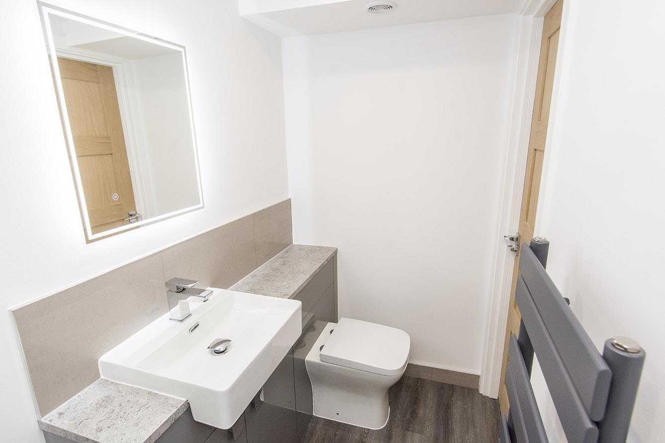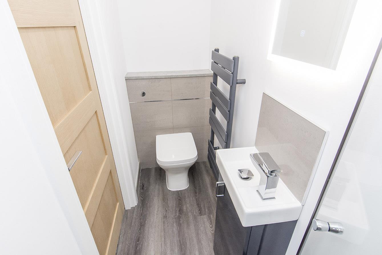 Bedroom Two En-Suite - 2.59m x 1.14m (8'6" x 3'9") - WC and wash hand basin inset to storage units. Double width shower cubicle with rain and flexible shower heads. Spotlights to ceiling. Heated towel rail. Extractor fan. Luxury vinyl tiled flooring. Lit mirror.