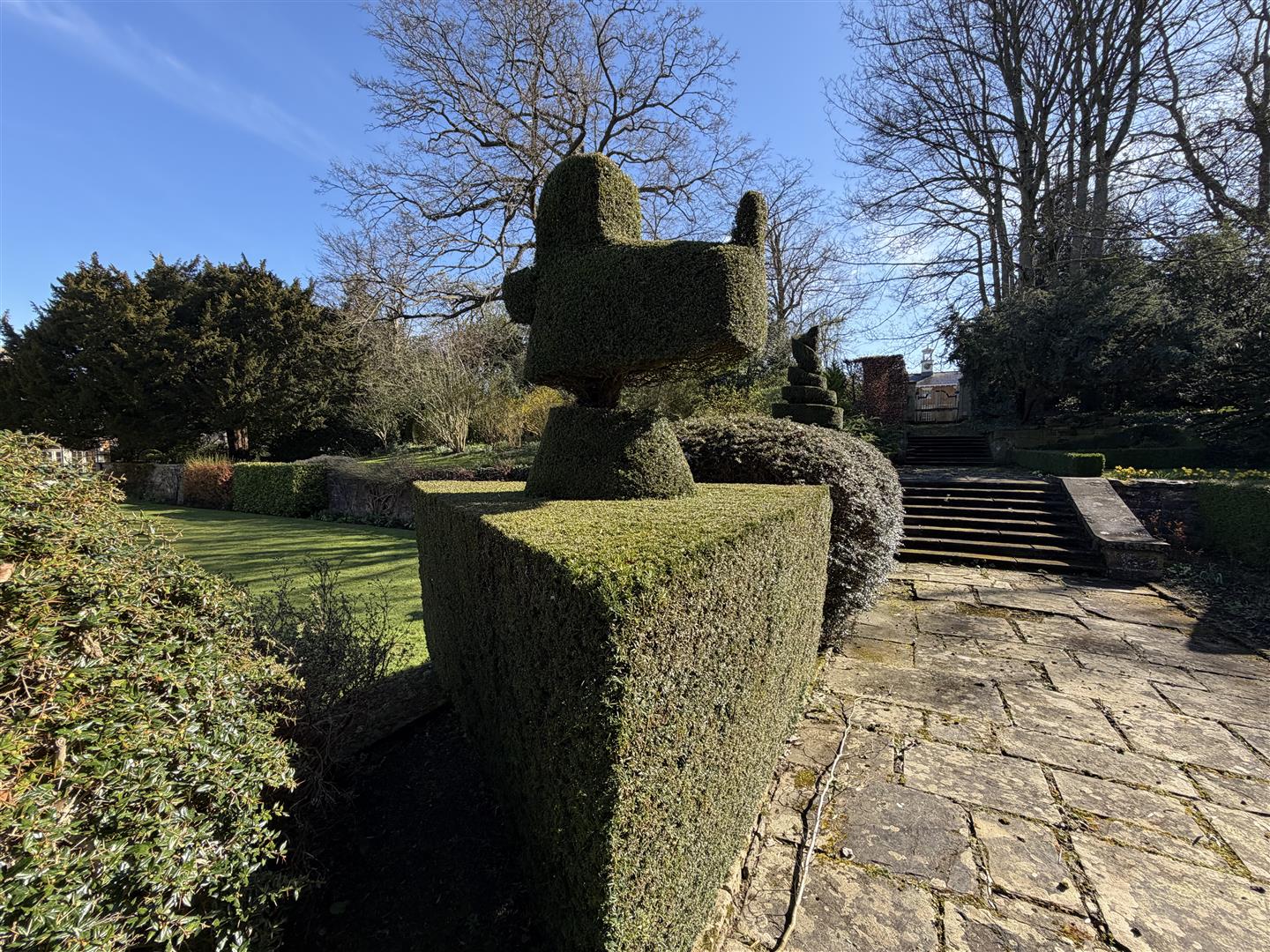 Outside Rear - The beautiful formal gardens extend to approximately half an acre and includes the original croquet lawn. There is a flagstone patio area with rose beds and low stone wall. The gardens are tree lined on the right hand side with topiary hedging at the rear and stone wall to the left. Behind the hedging is a wide walkway leading to double timber gates to Church Street.