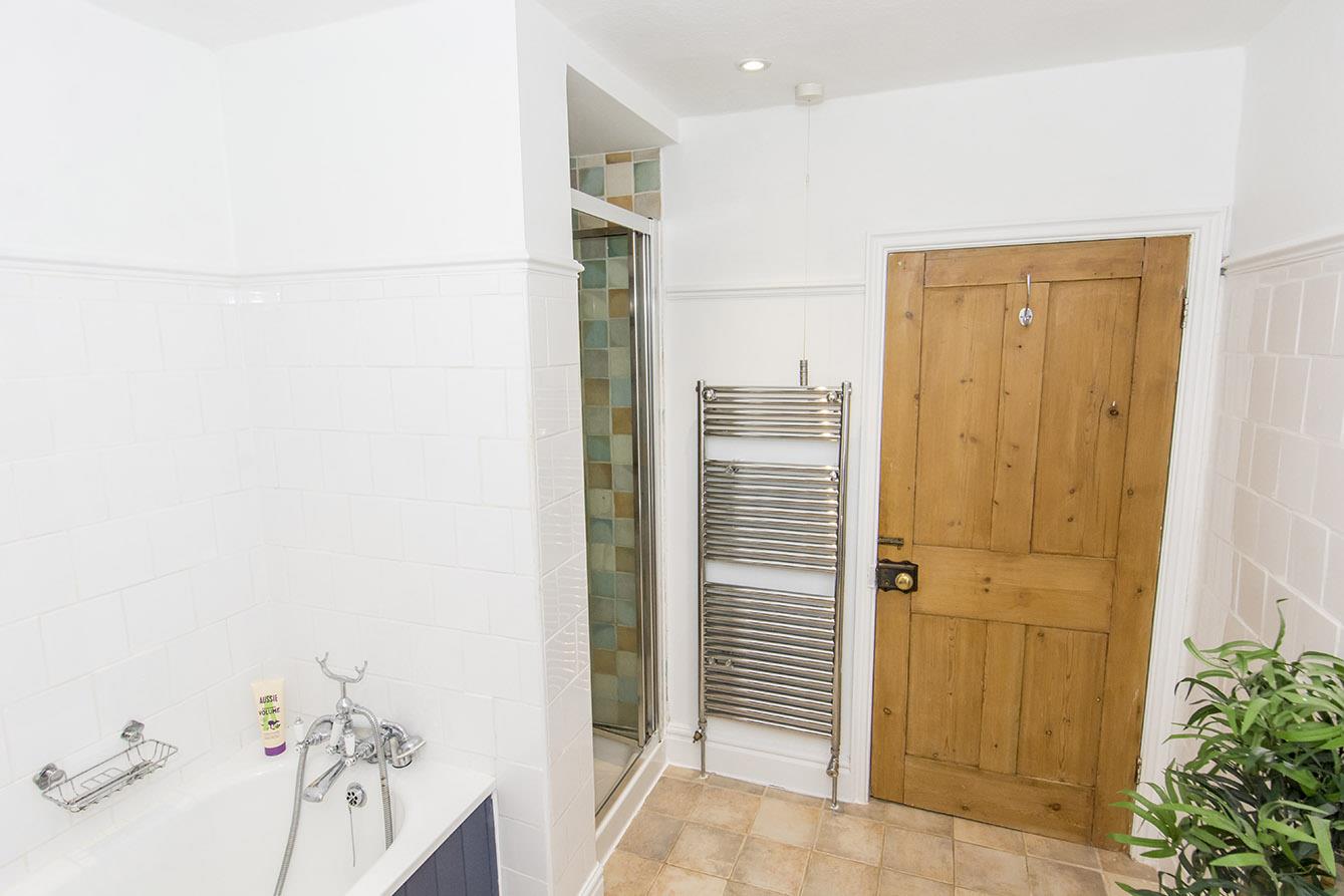 Bathroom - 2.64m x 2.31m (8'8" x 7'7") - Panelled bath. Tiled shower cubicle with mains rains shower fitment. Wash hand basin. Low level wc. Heated towel rail. Complimentary tiling. Radiator. Opaque double-glazed window. Electric shaver point.