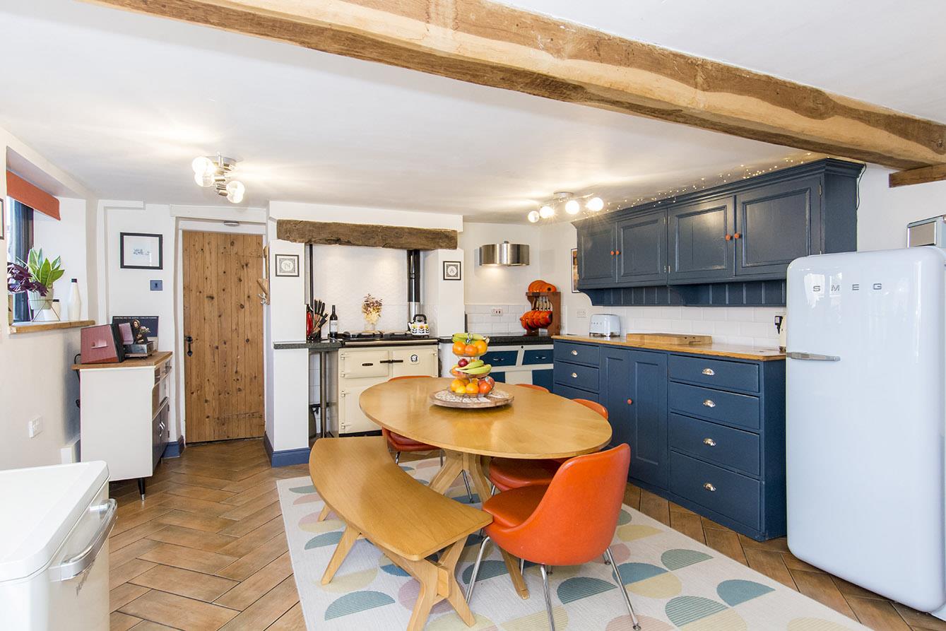 Kitchen/Diner - 5.38m x 4.11m (17'8" x 13'6") - The heart of the home this wonderful dining kitchen is fitted with bespoke hand painted cabinets with a combination of granite and solid oak work surfaces. A retro Paul Argyle stainless steel sink unit with mixer taps. Induction hob and extractor fan. A brick Inglenook with oak beam over houses the Rayburn cooker. There is a space for a fridge freezer and ample room for a dining table . Column radiator and ceramic tiled flooring. Two double-glazed windows to the side aspect and a sliding door opens into the utility. An aluminum door opens into the porch and boot room.