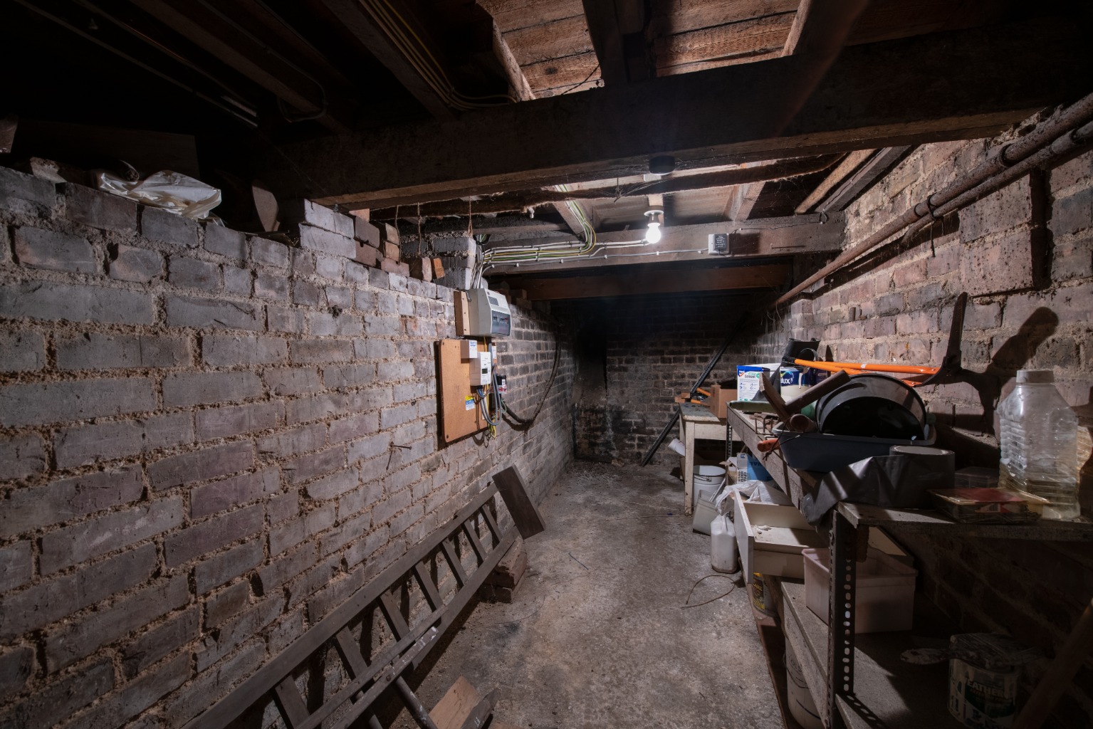 This attractive Victorian property sits on a quiet residential street, separated from the road by a paved front garden. The façade features a full-height, square bay window, and the smart, black-painted door with a window above it welcomes you into the large hallway, which provides access to a useful cellar below.