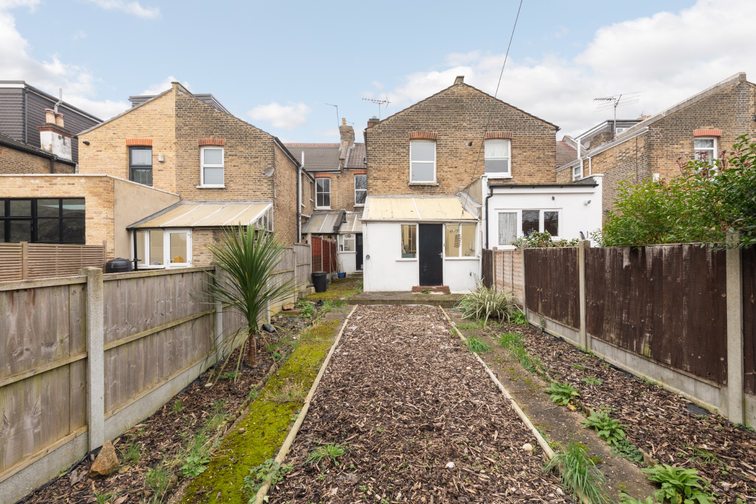 Adjoining the kitchen, the second reception would make an ideal dining space, with a generous footprint and a handy built-in storage cupboard. Entering into the kitchen, housed in a lean-to extension with full skylights, you’ll find all the essentials needed to keep fed and watered throughout your exciting renovation. Through the rear door, you enter the large garden – fenced around the perimeter for privacy, with plenty of room to create the outdoor space of your dreams.