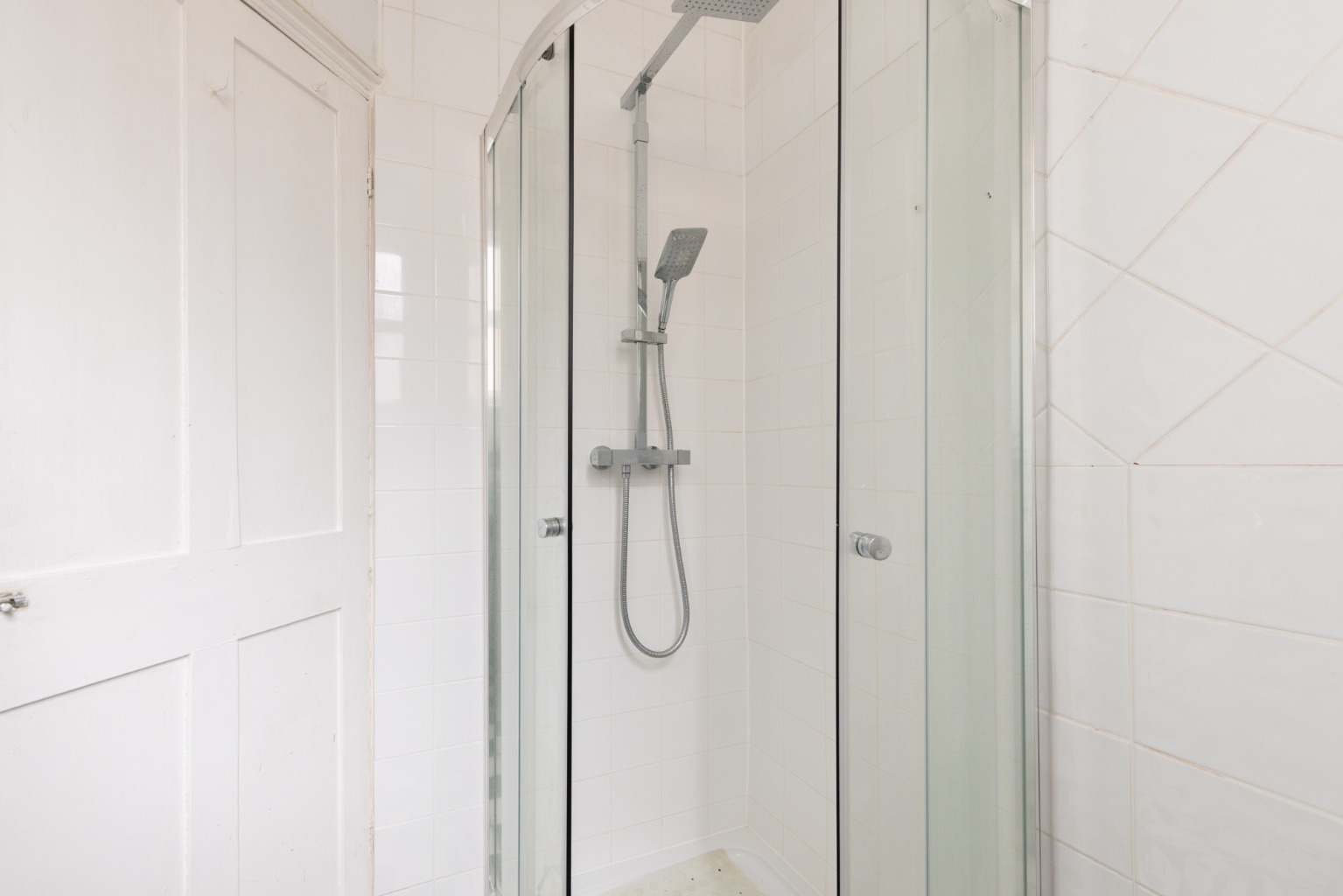 Between the middle and rear bedrooms is a shower room, fully fitted with a fresh white three-piece suite consisting of WC, sink, and a fully glazed shower cubicle, and finished with white tiling and black-and-white checkered flooring.