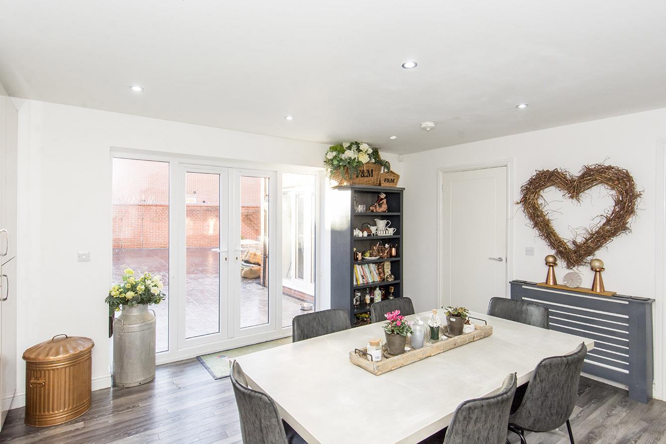 Dining Kitchen - 4.80m x 4.42m (15'9" x 14'6") - Fitted with modern gloss cabinets and complimenting work surfaces over. The kitchen has a stainless steel bowl and a half sink with mixer taps and an integrated dishwasher. There are a set of French doors opening into the garden and two windows to the side aspect - allowing an abundance of natural light to flow through this space. There is ample room for a full sized dining table. There is a double oven with an induction hob. Karndean flooring throughout.