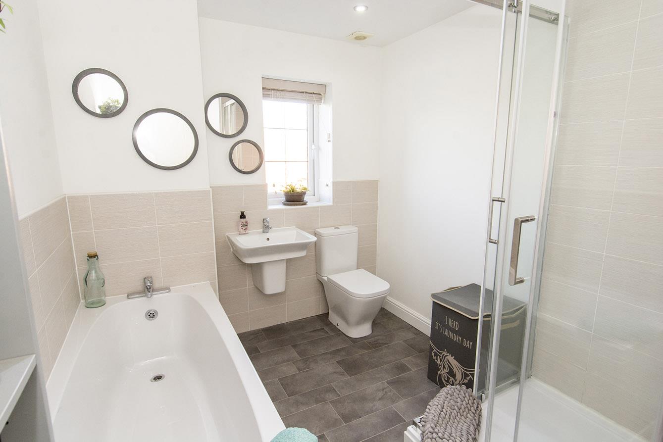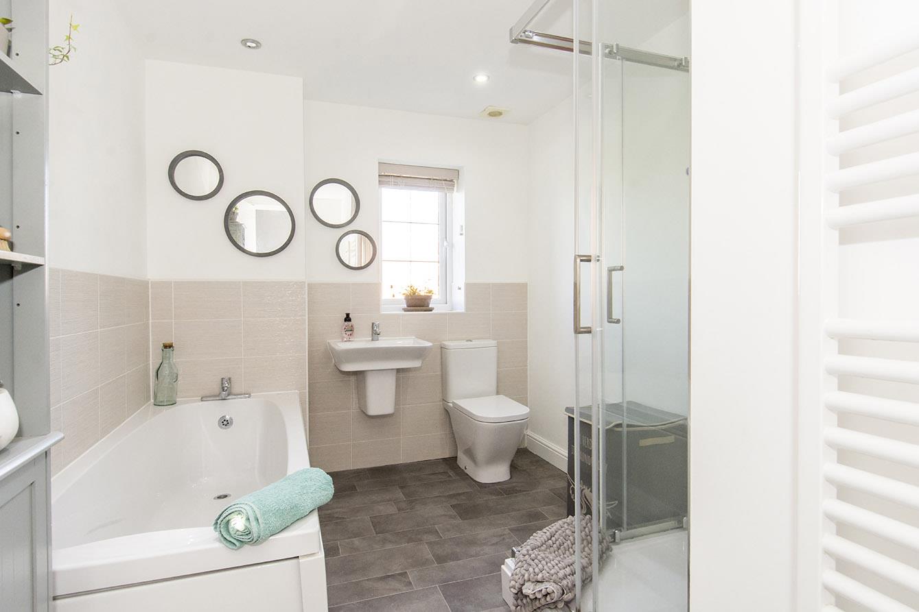 Bathroom - 3.25m x 2.26m (10'8" x 7'5") - Fitted with a low-level W/C, wall hung wash hand basin, bath and a separate shower. Ceramic wall tiles and vinyl tiled flooring. Heated towel rail. Opaque glazed window.