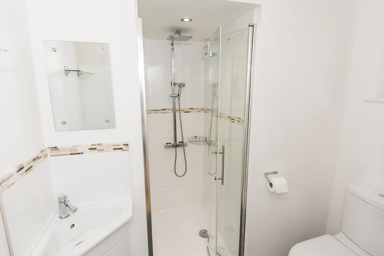 Cloakroom - 0.91m x 2.01m (3'0" x 6'7") - Fitted with a low-level W/C, corner wash hand basin, shower and a chrome heated towel rail. Ceramic wall and floor tiles throughout. Window to the front aspect.