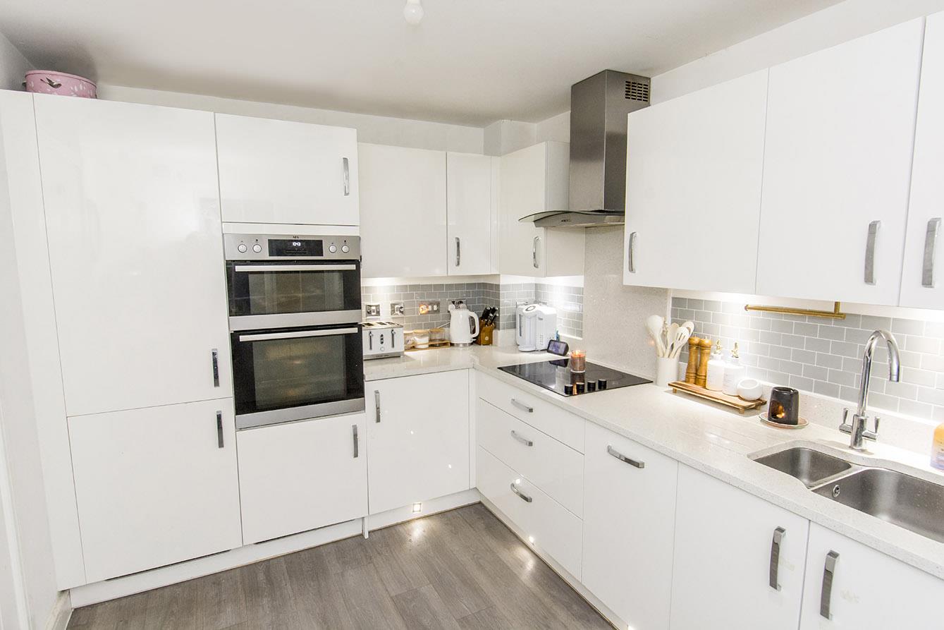 Breakfast Kitchen - 3.40m x 2.54m (11'2" x 8'4") - UPVC double-glazed window to front. Fitted range of wall and floor mounted units with upgraded quartz worktops. One and a half bowl sink inset. Electric double oven. Ceramic hob with extractor hood over. Integrated fridge/freezer. Breakfast bar. Integrated washing machine. Integrated dishwasher.