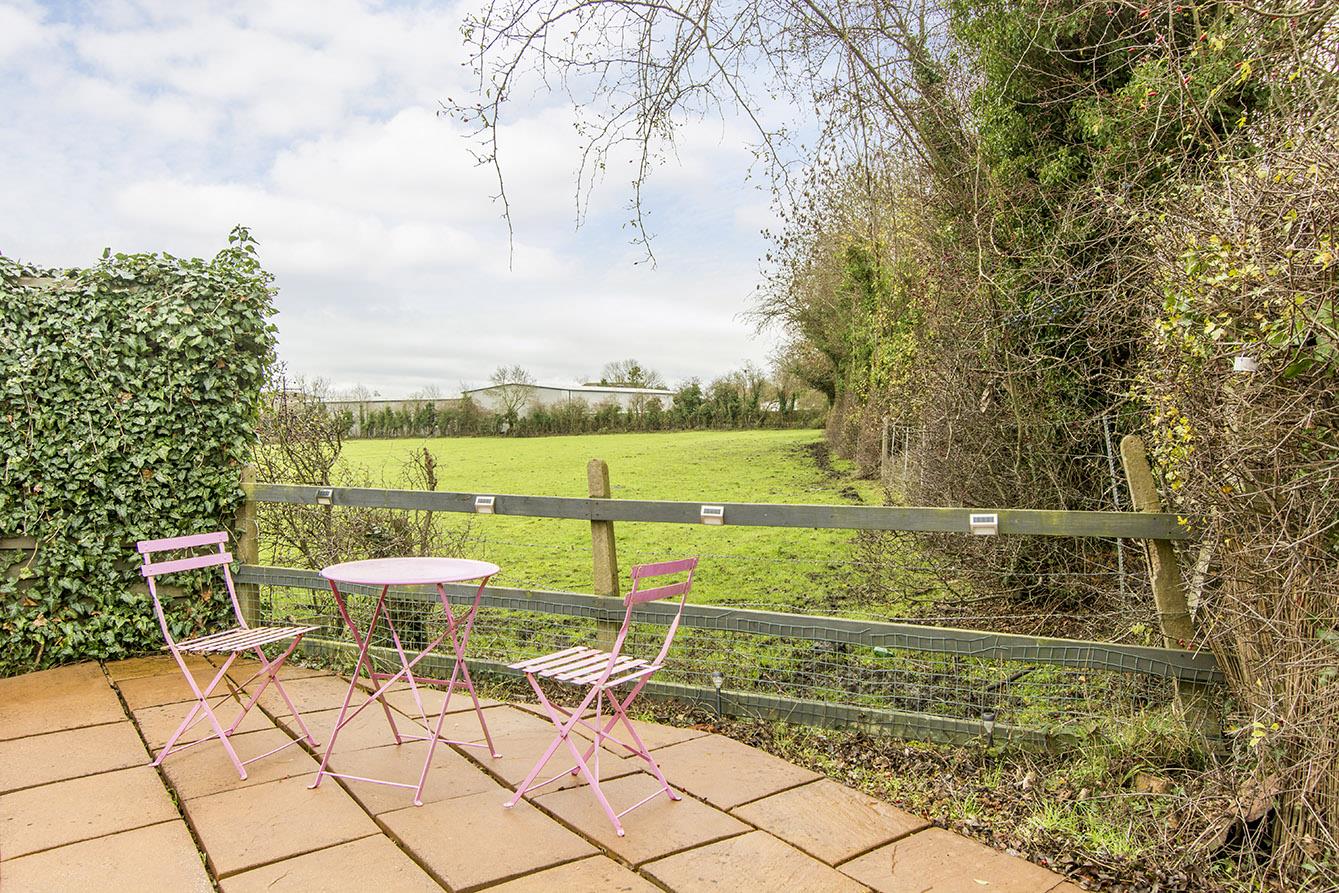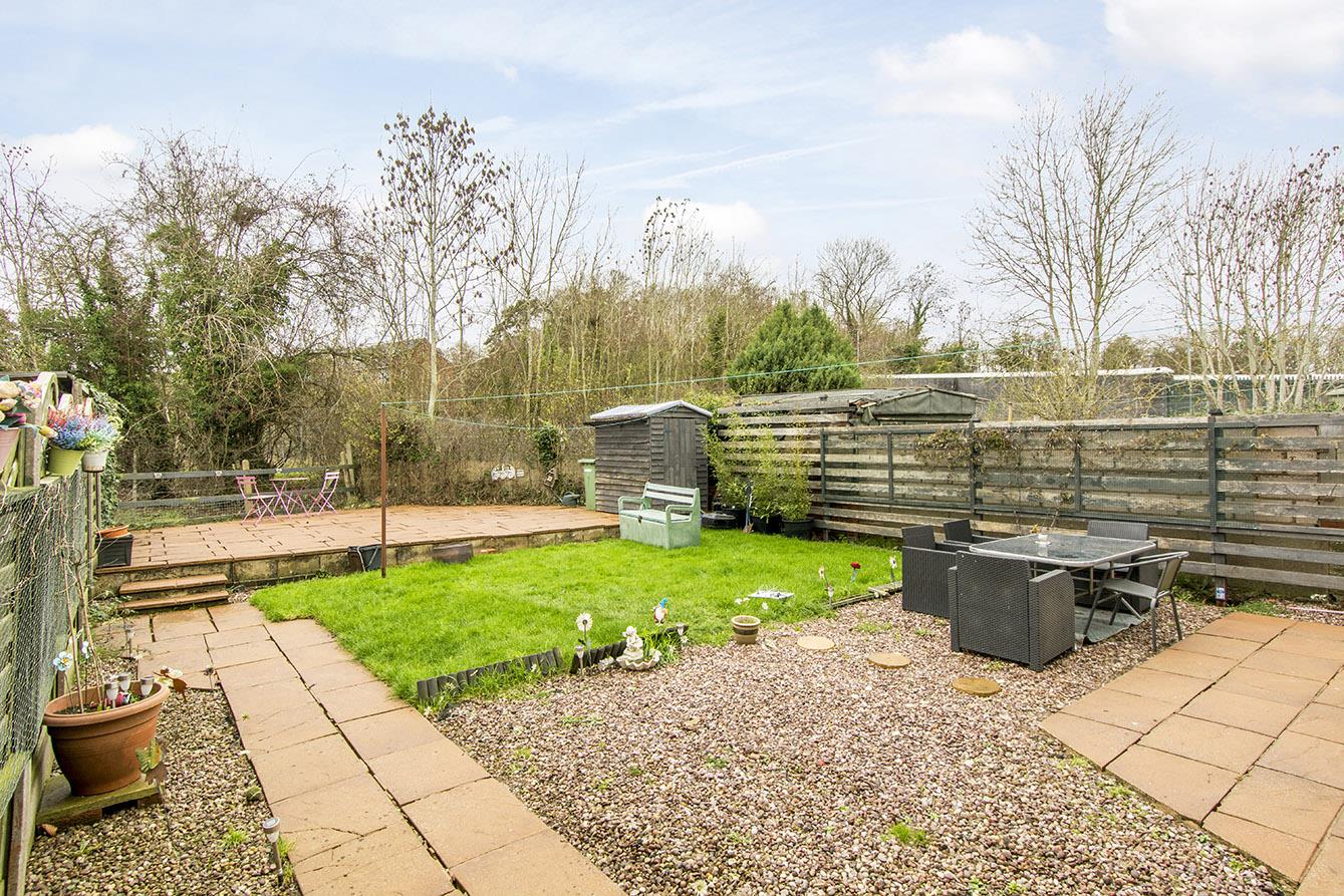 Rear Garden - Variety of paved pathway and patio areas. Lawned area. Backing onto an open field.