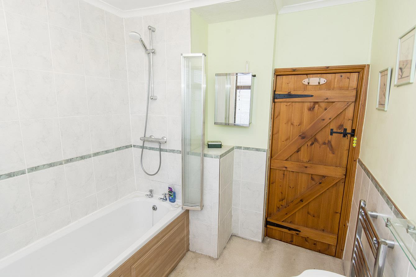 Bathroom - 2.74m approx max to point x 2.13m max width (9'0" - Opaque UPVC double-glazed window to front. WC. Wash hand basin. Panelled bath with built in shower and glazed shower screen. Tiled splash backs. Heated towel rail.