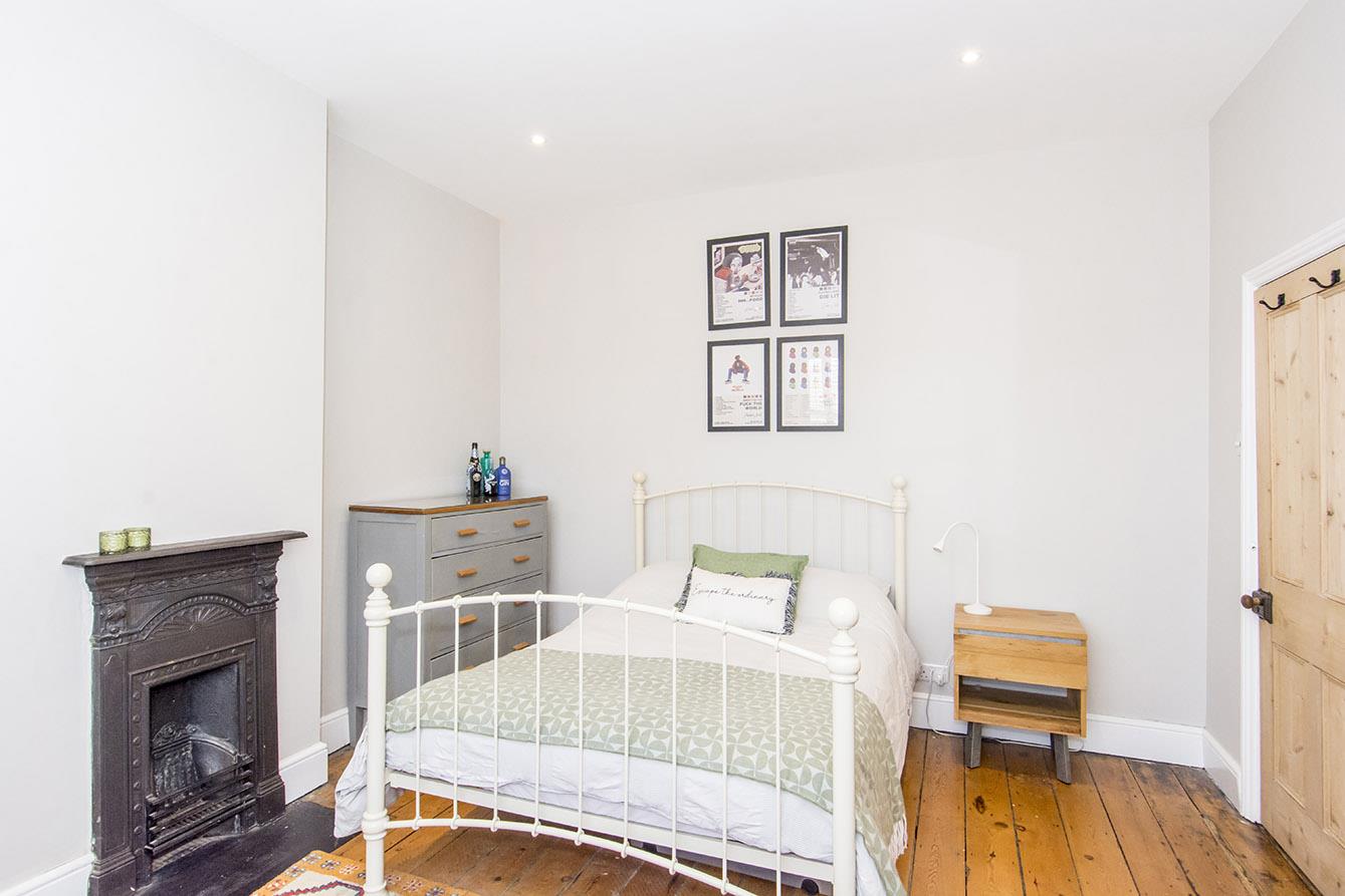 Bedroom Two - 4.24m x 3.68m (13'11" x 12'1") - Shuttered double-glazed window to front elevation. Feature cast iron period fireplace. Vertical column radiator. Stripped wooden floorboards.