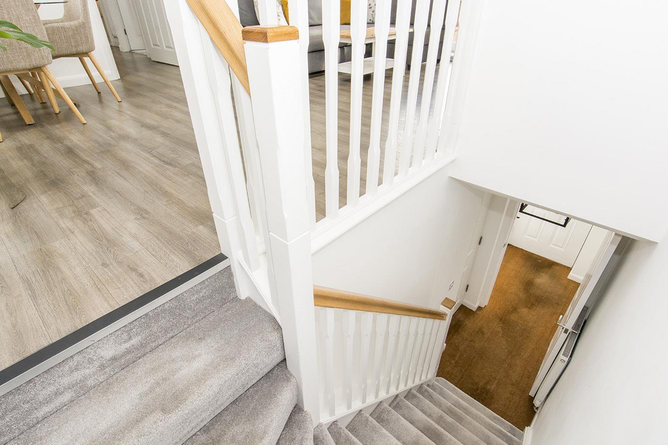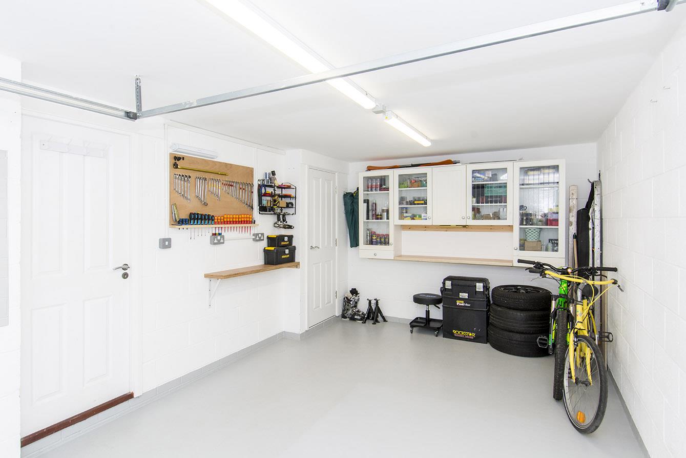 Garage - 5.41m x 3.28m max (17'9" x 10'9" max) - Up and over door. Power and lighting. Shelved under stairs storage cupboard. Internal access from property.
