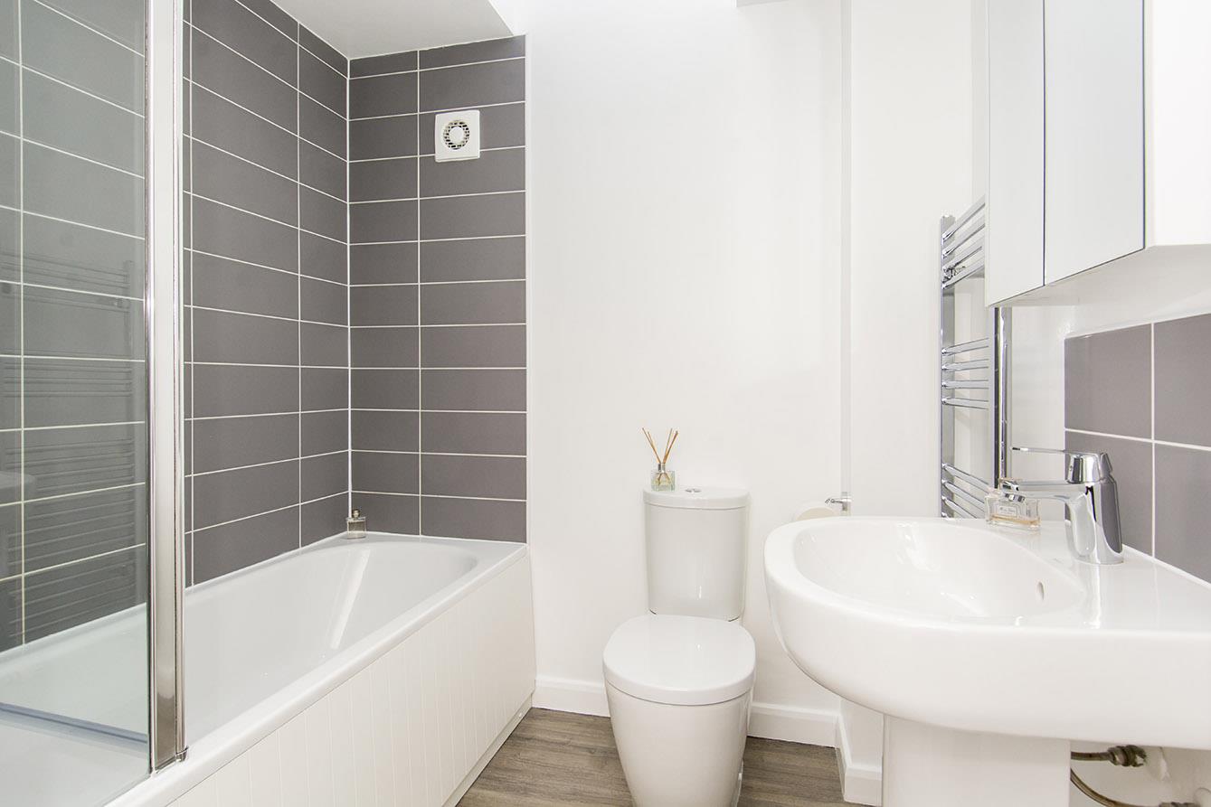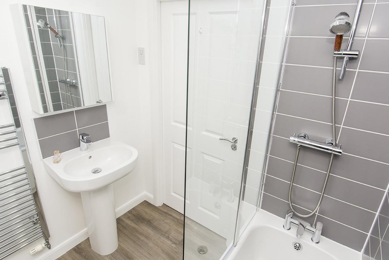 Bathroom - Panelled bath with mains shower fitment over. Pedestal wash hand basin. Low level WC. Heated towel rail. Complementary tiling. Wood laminate effect vinyl flooring. Double glazed velux window. Electric shaver point. Extractor fan.