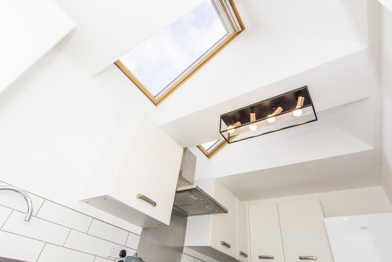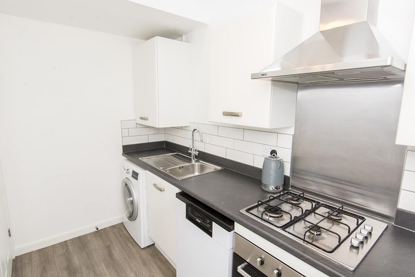 Kitchen - 3.73m x 2.06m (12'3" x 6'9") - Range of white matt fronted base and wall units. Laminated work surfaces with complementary tiled splash backs. Fitted oven and four ring gas hob with extractor hood over. Space and plumbing for automatic washing machine and dishwasher. Space and point for fridge/freezer. Two double glazed velux windows. Radiator. Gas fired combination central heating boiler. Stainless steel sink and drainer.