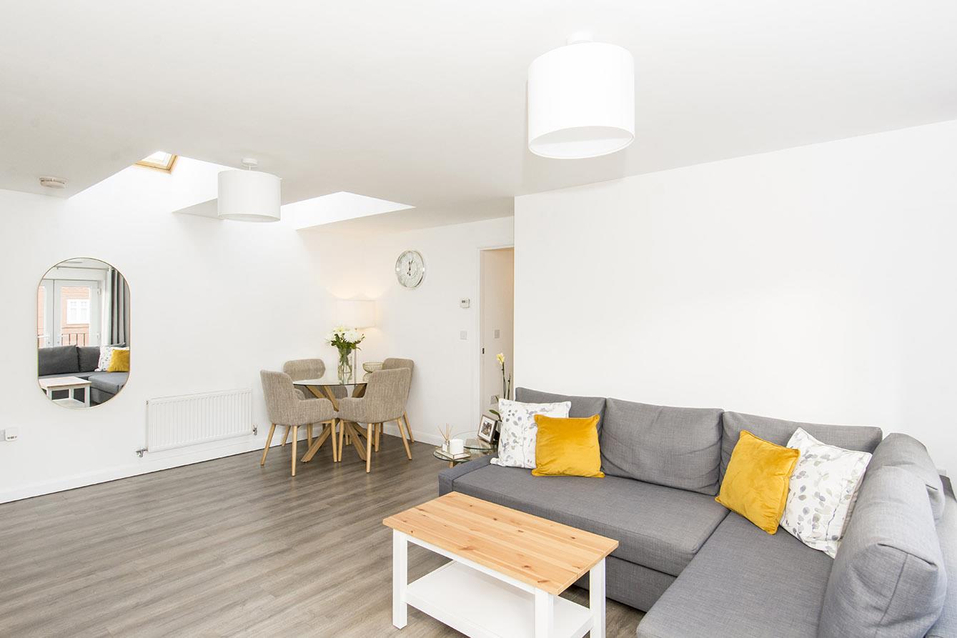 First Floor Lounge/Diner - 5.36m x 4.11m max (17'7" x 13'6" max) - Timber balustrade. Two radiators. Two double glazed velux windows. Luxury vinyl tile flooring. Double glazed French door opening out to a 'Juliet' balcony. Double glazed window to the front elevation. Shelved storage cupboard. Door to:-
