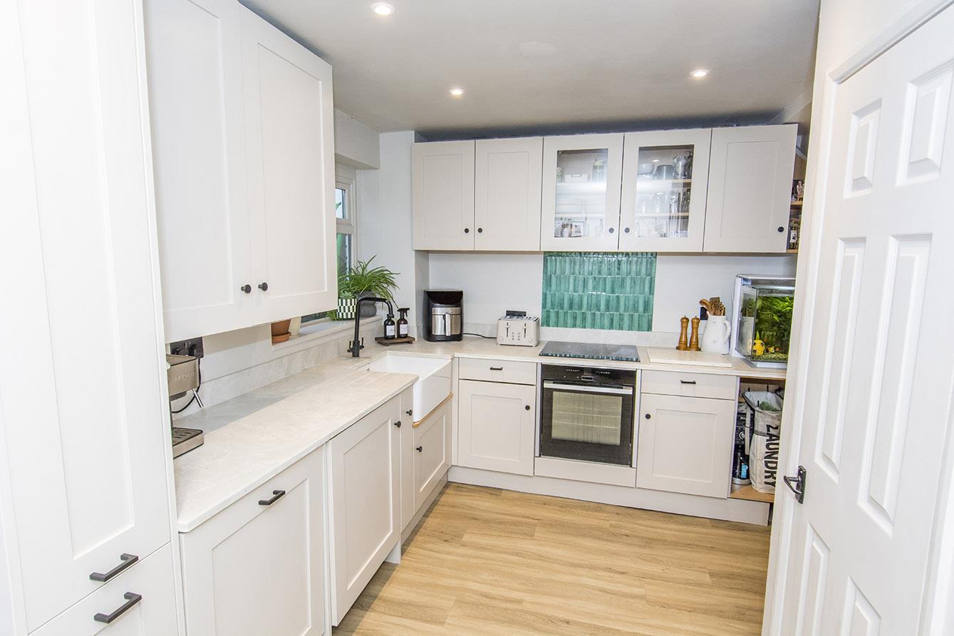 Kitchen/Diner - 4.83m x 2.79m (15'10" x 9'2") - UPVC double-glazed window to rear. UPVC double-glazed French doors to rear. Fitted range of wall and floor mounted units with acrylic work tops and Belfast sink inset. Electric oven. Induction hob. Integrated dishwasher. Integrated washing machine. Space for fridge freezer. Cupboard housing refitted 'Ideal' gas combination central heating boiler. Designer radiator.