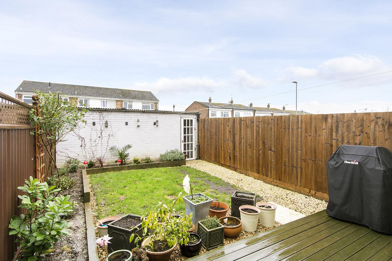 Rear Garden - Lawned with timber decking. Timber edged plant boarders. Gravelled path leading to the garage pedestrian access door.