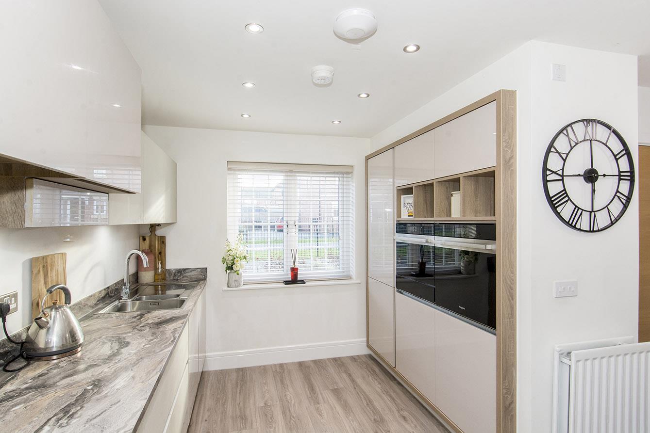 Kitchen/Diner - 2.24m to the face of units x 3.94m + 2.62m x 2.01m - Full modern range of fitted base and wall units. Laminate work surfaces with complimentary tiled splash backs. Fitted appliances to include; two ovens, four ring gas hob with filter extractor fan over, automatic dishwasher, refrigerator and freezer. Stainless steel one and a half bowl sink and drainer. Wood laminate flooring. Radiator. Double-glazed window to the front elevation. Stairs rise in to the first floor. Inset ceiling downlighters. Opening through to inner hall.