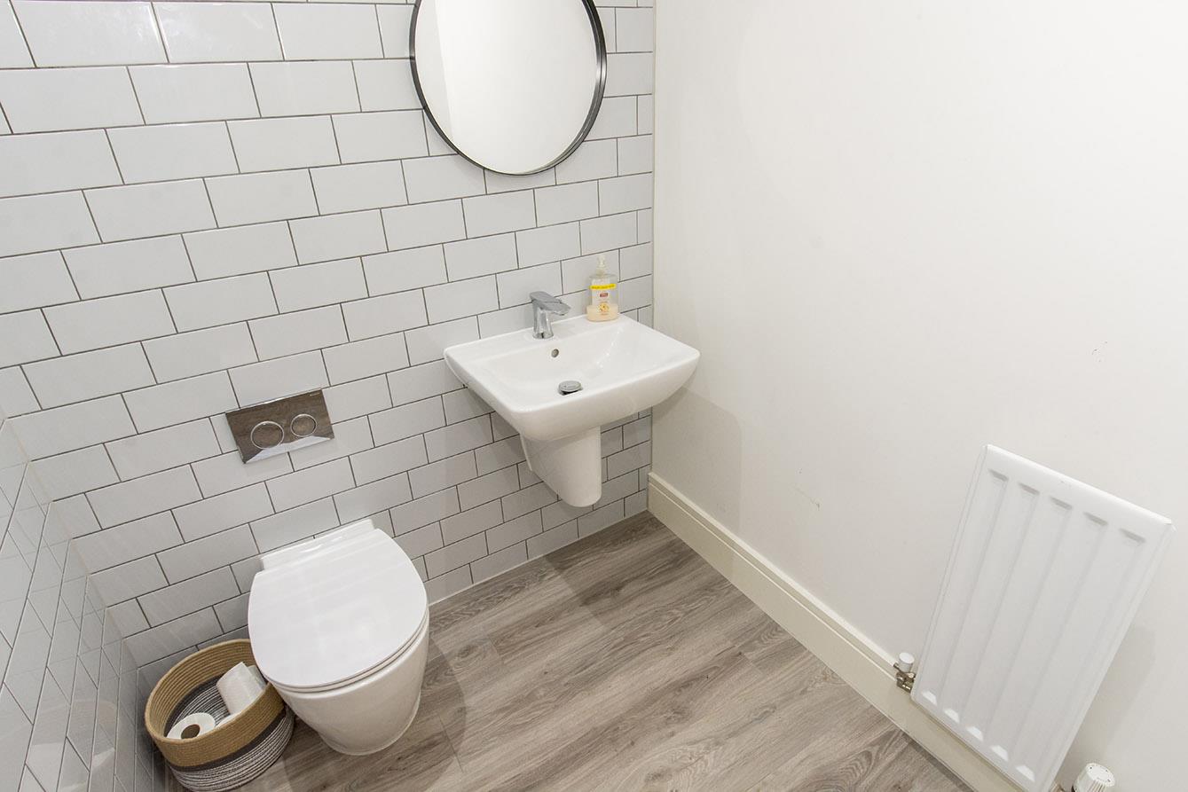 Cloak Room/Wc - Low level wc. Wash hand basin. Radiator. Complimentary tiling. Extractor fan. Wood laminate flooring. Inset ceiling downlighters.