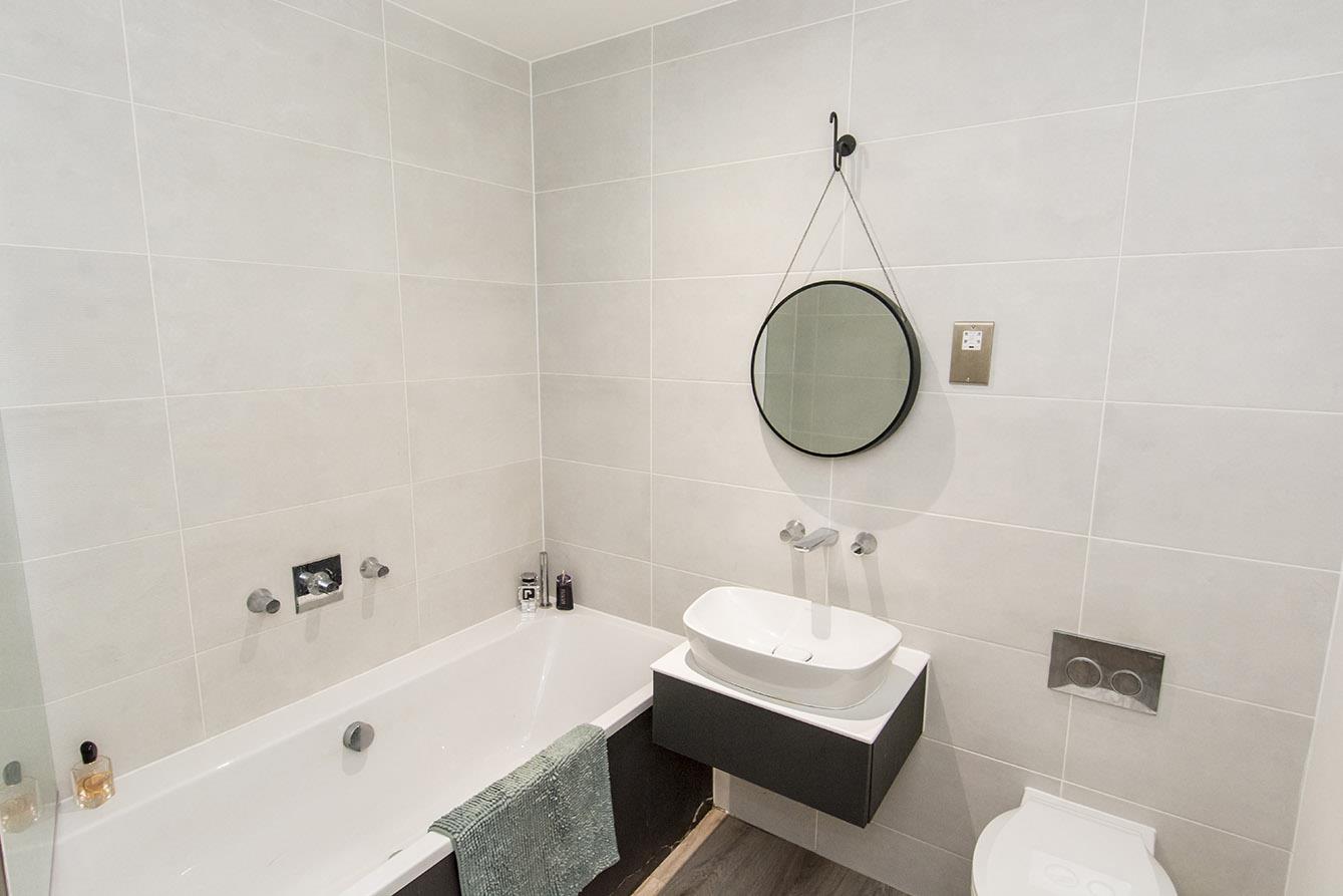 Bathroom - Panelled bath with rain shower fitment over. Wash hand basin. Low level wc. Complimentary tiling. Wood laminate flooring. Heated towel rail. Electric shaver point.