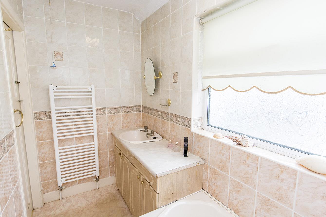 Bathroom - 2.97m x 1.30m (9'9" x 4'3" ) - Opaque UPVC double-glazed window to front. WC. Wash hand basin over storage unit. Panelled bath with shower mixer tap and glazed shower screen. Tiled walls. Heated towel rail.