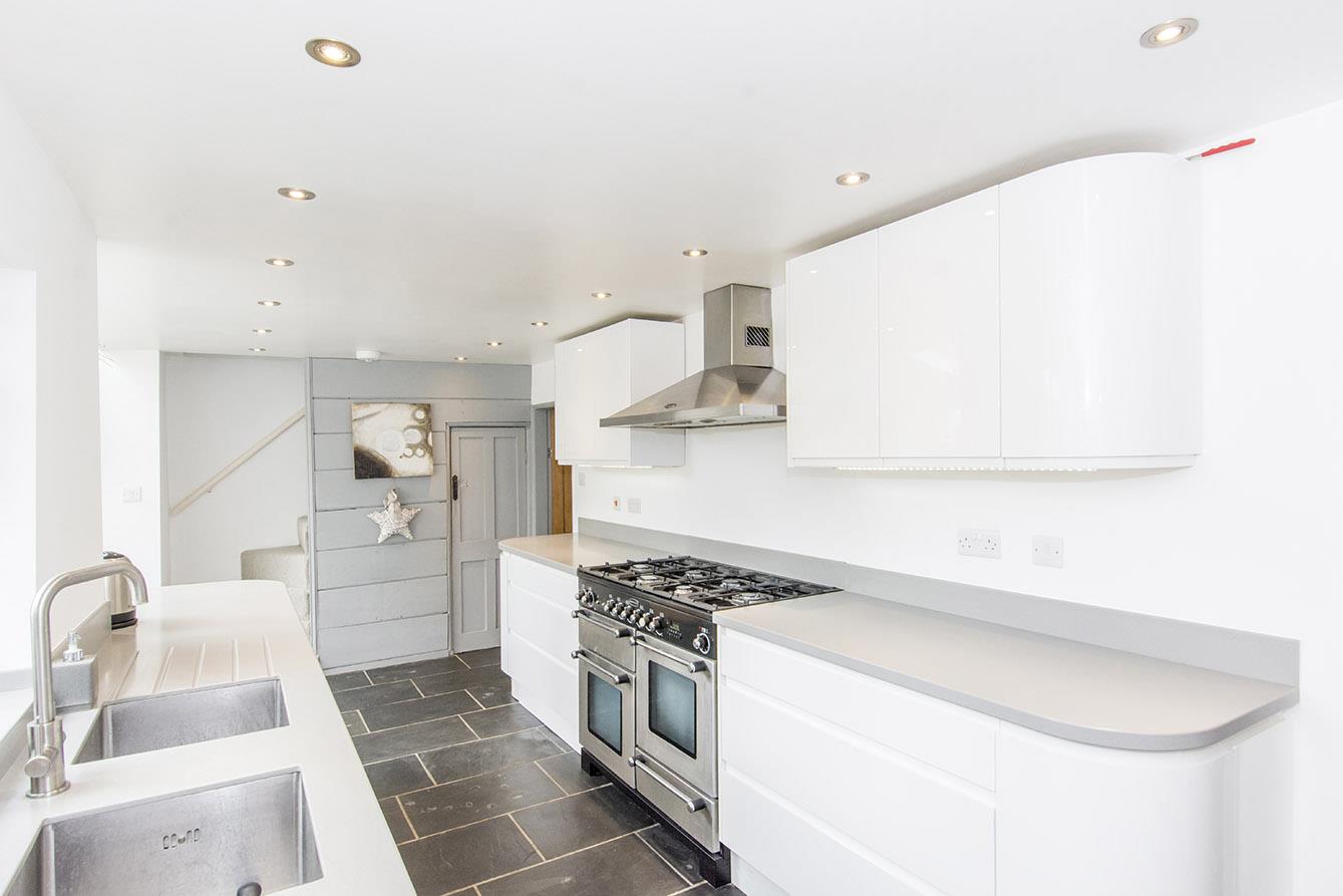 Kitchen Area - 6.48m x 2.31m (21'3" x 7'7") - Bespoke modern fitted kitchen with a range of white high gloss fronted base and wall units. Grey composite fitted work surfaces and splash backs incorporating two stainless steel sinks and a moulded drainer. Fitted appliances to include full height fridge and freezer, oven and gas range cooker with stainless steel extractor hood over. Space and plumbing for automatic dishwasher. Slate tiled flooring with under floor heating. Stairs rising to the first floor and under stairs storage cupboard. Window to the rear. Door to the study and opening through to:-