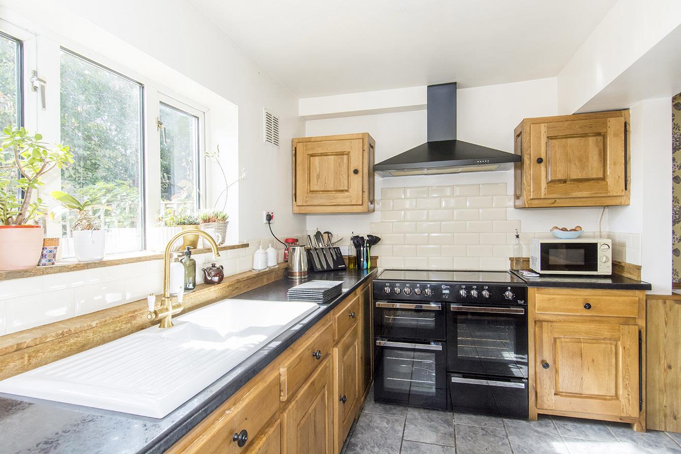 Kitchen - 2.39m x 3.30m (7'10" x 10'10") - Fitted with hand crafted wooden cabinets with composite work surfaces over. Porcelain bowl and a half sink with mixer taps. Range style cooker with induction hob and extractor fan. There is space for a dishwasher and fridge. Ceramic tile flooring throughout and a window to the front aspect.