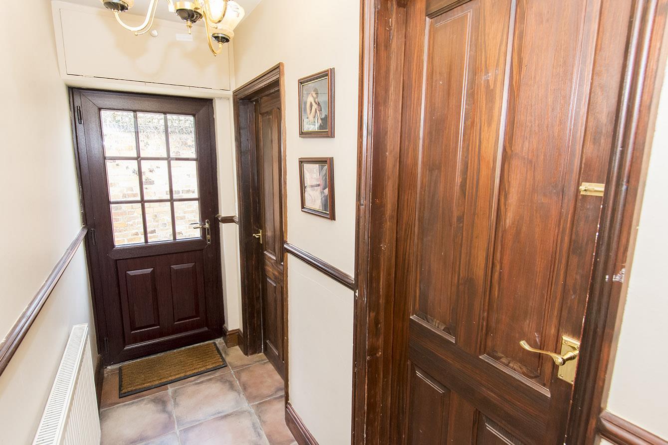 Inner Hallway - Stairs rise into the first floor. Radiator. Wall light. Doors to rooms.