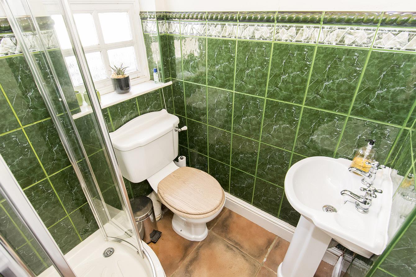 Shower Room - Tiled shower cubicle with electric shower fitment. Pedestal wash hand basin. Low level w/c. Complimentary tiling. Opaque double-glazed window. Radiator.