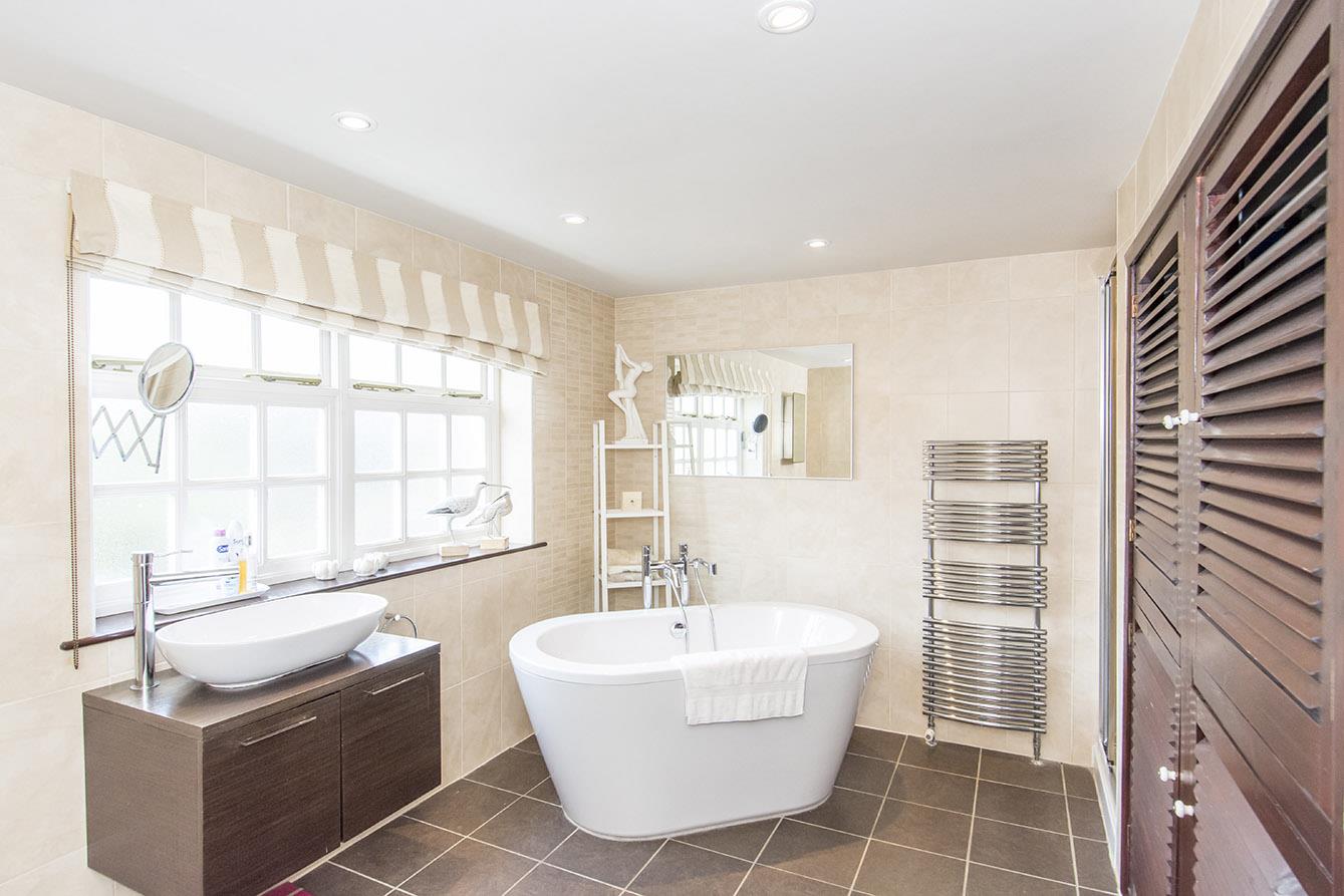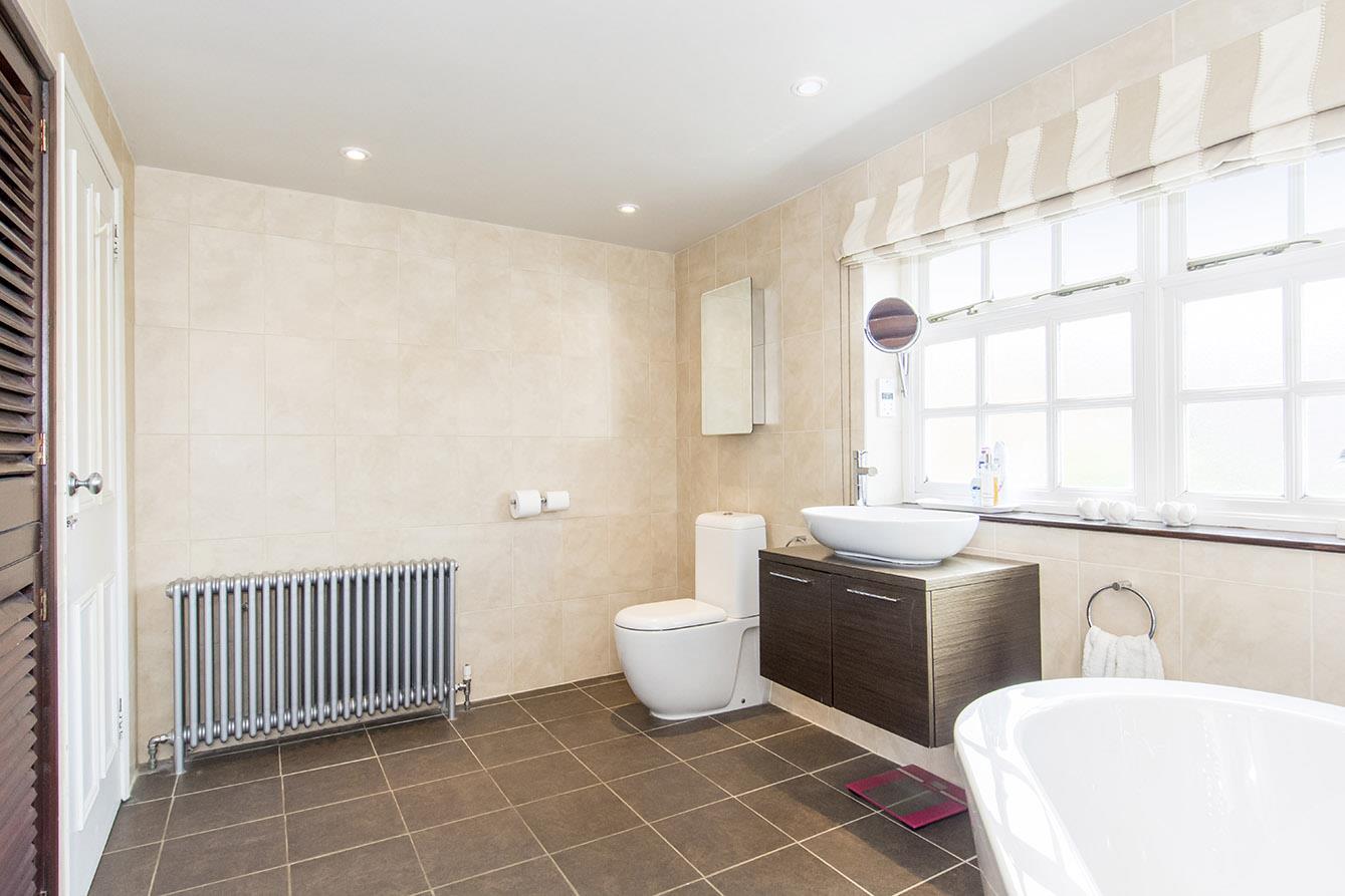 Bathroom - 3.84m x 2.34m (12'7" x 7'8") - Roll top bath. Shower cubicle with main shower fitment. Wash hand basin. Low level w/c. Complimentary tiling. Airing cupboard housing hot water tank and shelving. Heated towel rail. Tiled floor. Opaque double-glazed window.