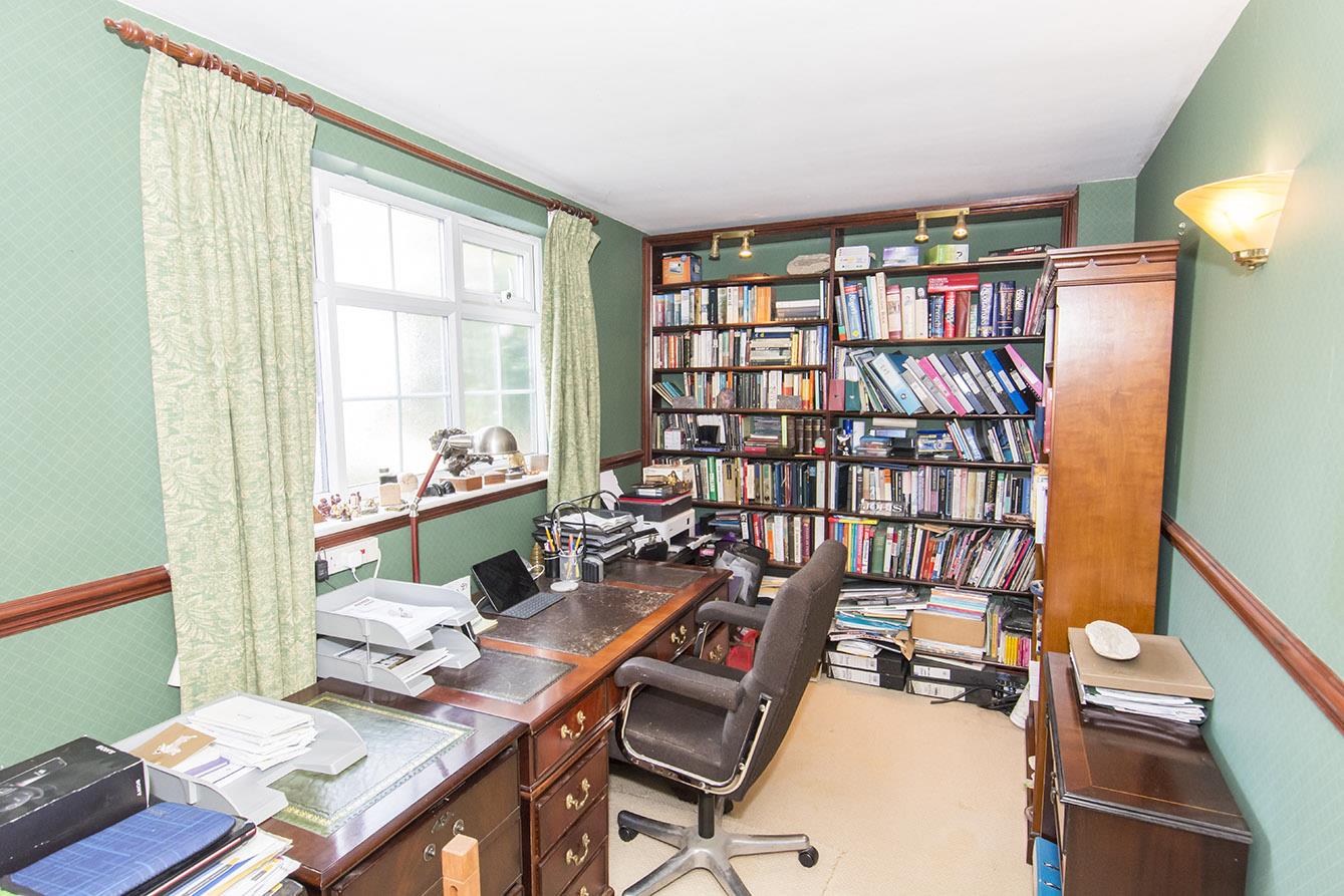 Study - 3.40m x 2.11m (11'2" x 6'11") - Opaque double-glazed window. Radiator. Fitted book shelving. Two wall lights.