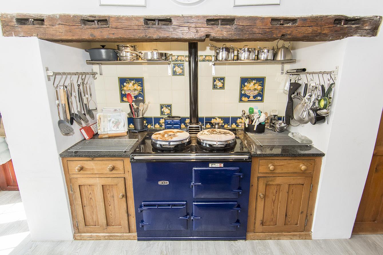 Kitchen / Diner - 6.99m x 5.36m (22'11" x 17'7") - Farm house style kitchen. Solid timber fitted base and wall units. ingle nook style recess incorporating oil fired arger. Solid granite work surfaces. Complimentary tiled splash backs. Fitted free standing electric cooker. Exposed timber beams. Large butler sink. Island unit with granite worktops. Three wall lights. Multi-paned window to side elevation. Fitted plate racks and display cabinets. Double-glazed double doors leading to the garden. Door to utility room.