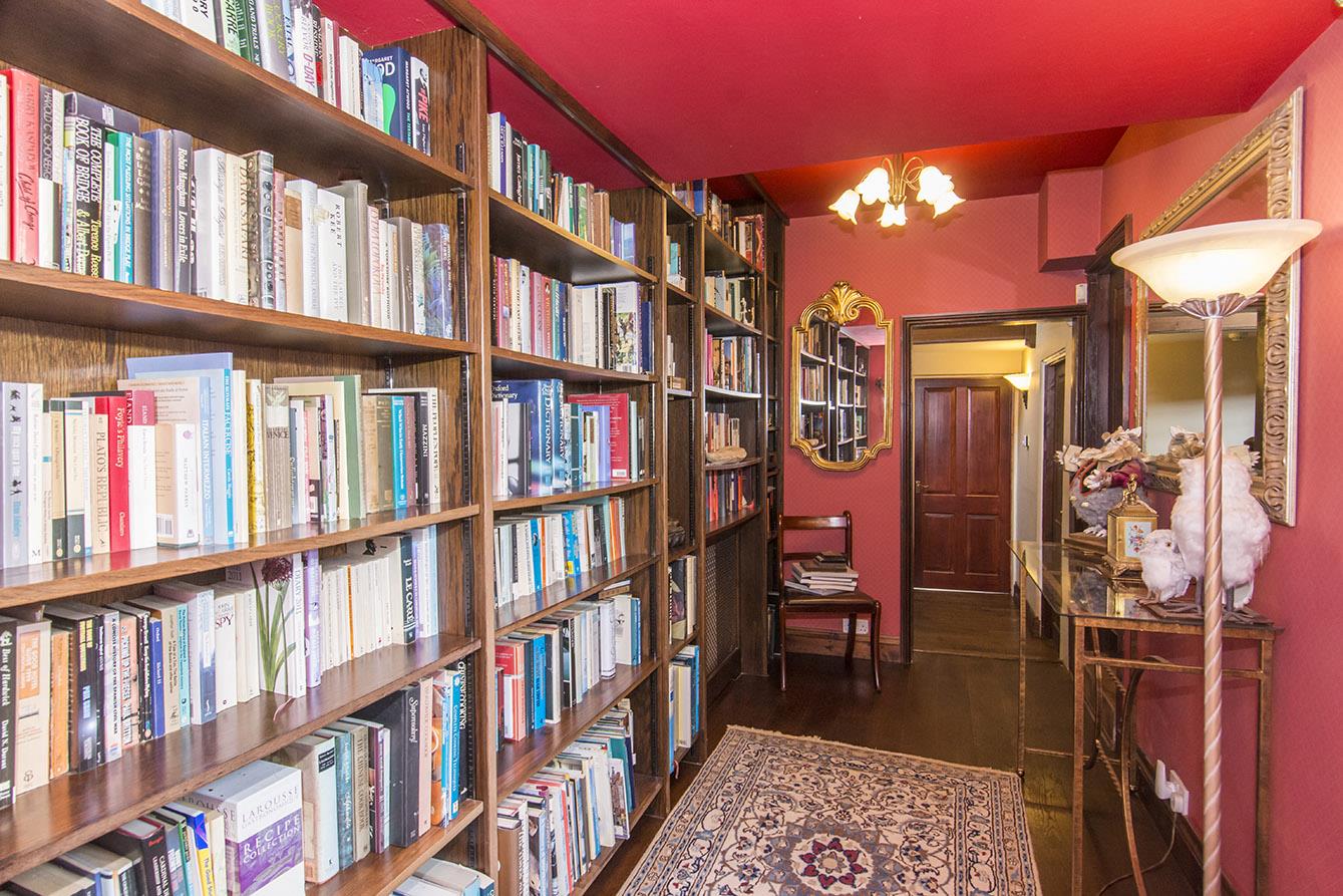 Library - 4.14m x 1.91m (13'7" x 6'3") - Interconnecting room between the inner hallway and kitchen / diner. Multi-pane double-glazed window to the front elevation. Fitted book shelving spanning one wall. Radiator. Exposed timber flooring.