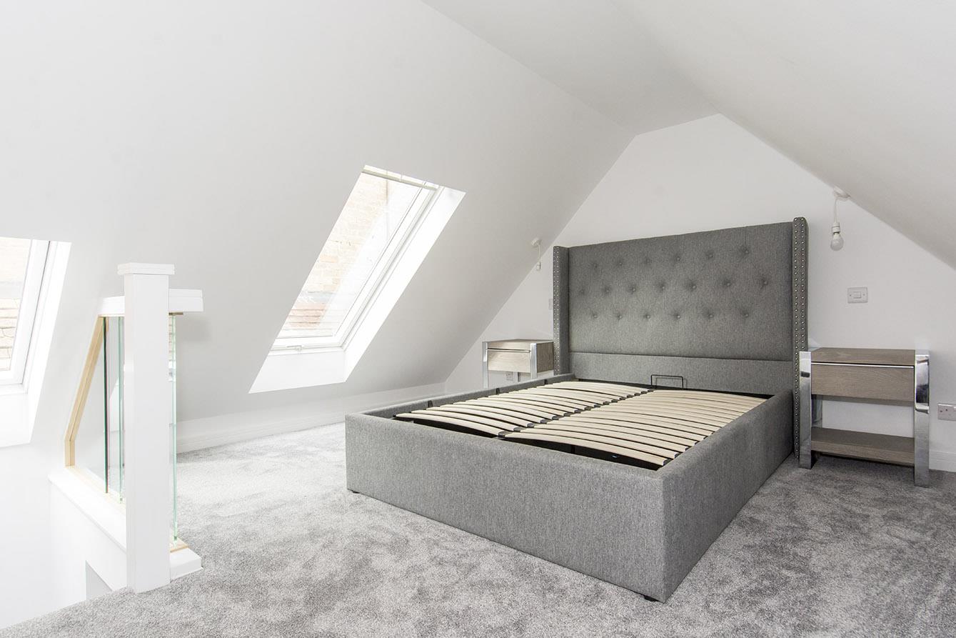 Mezzanine Bedroom - 4.29m with sloping ceilings x 3.96m to balustrade) - Two double-glazed sky lights. Smoke alarm to ceiling. Radiator. Stylish glass and timber balustrading overlooking void down to the living/dining/kitchen.