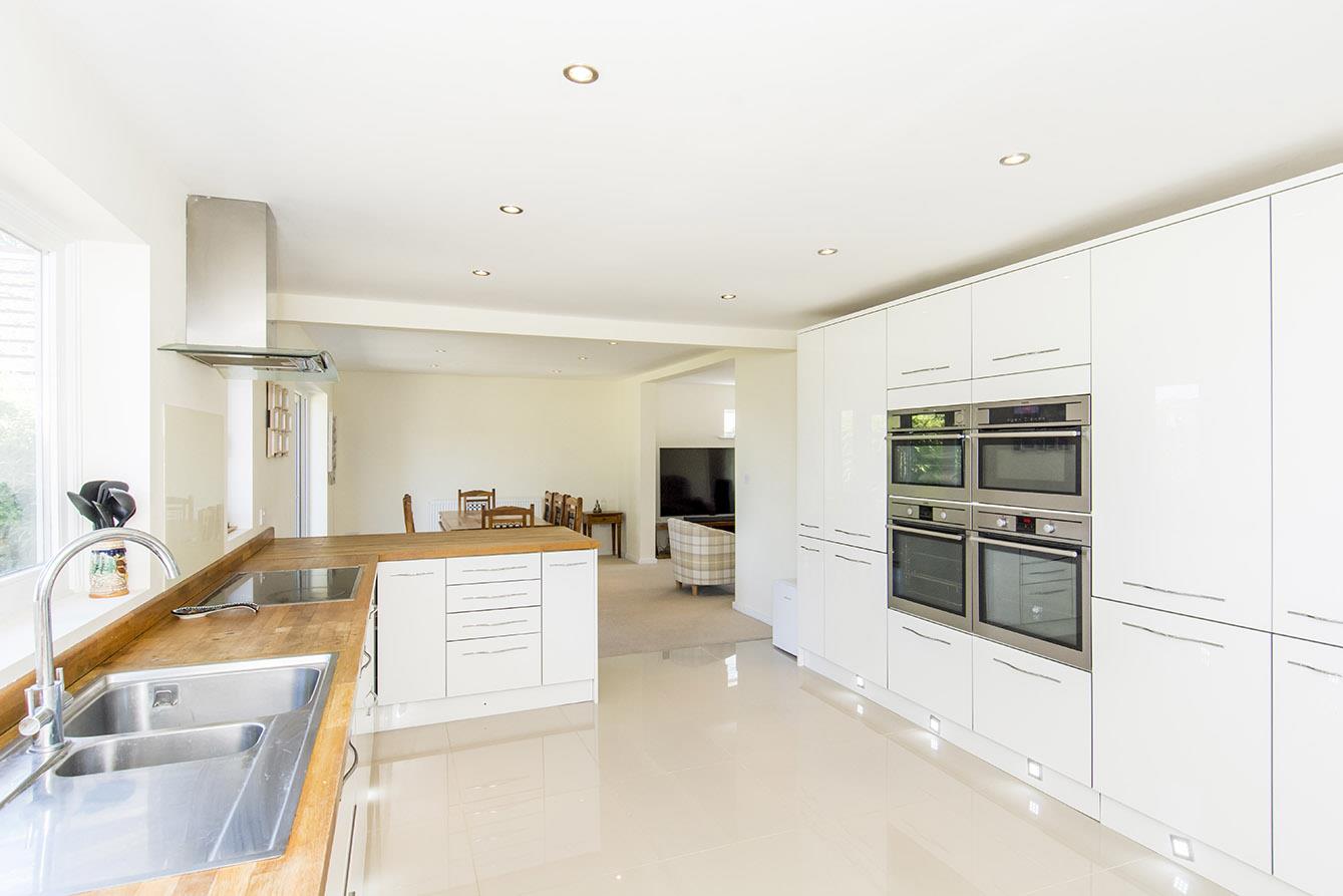 Kitchen - 5.13m x 3.73m (16'10" x 12'3") - Range of fitted white high gloss fronted base and wall units. Solid timber work surfaces and splashbacks. Fitted appliances to include four eye level ovens, four ring electric hob with stainless steel extractor hood over, automatic dishwasher, refrigerator and freezer. Stainless steel one and a half sink and drainer. Porcelain tiled flooring. Radiator. Two double glazed windows to the rear aspect. Opaque double glazed door leading outside and doorway to:-