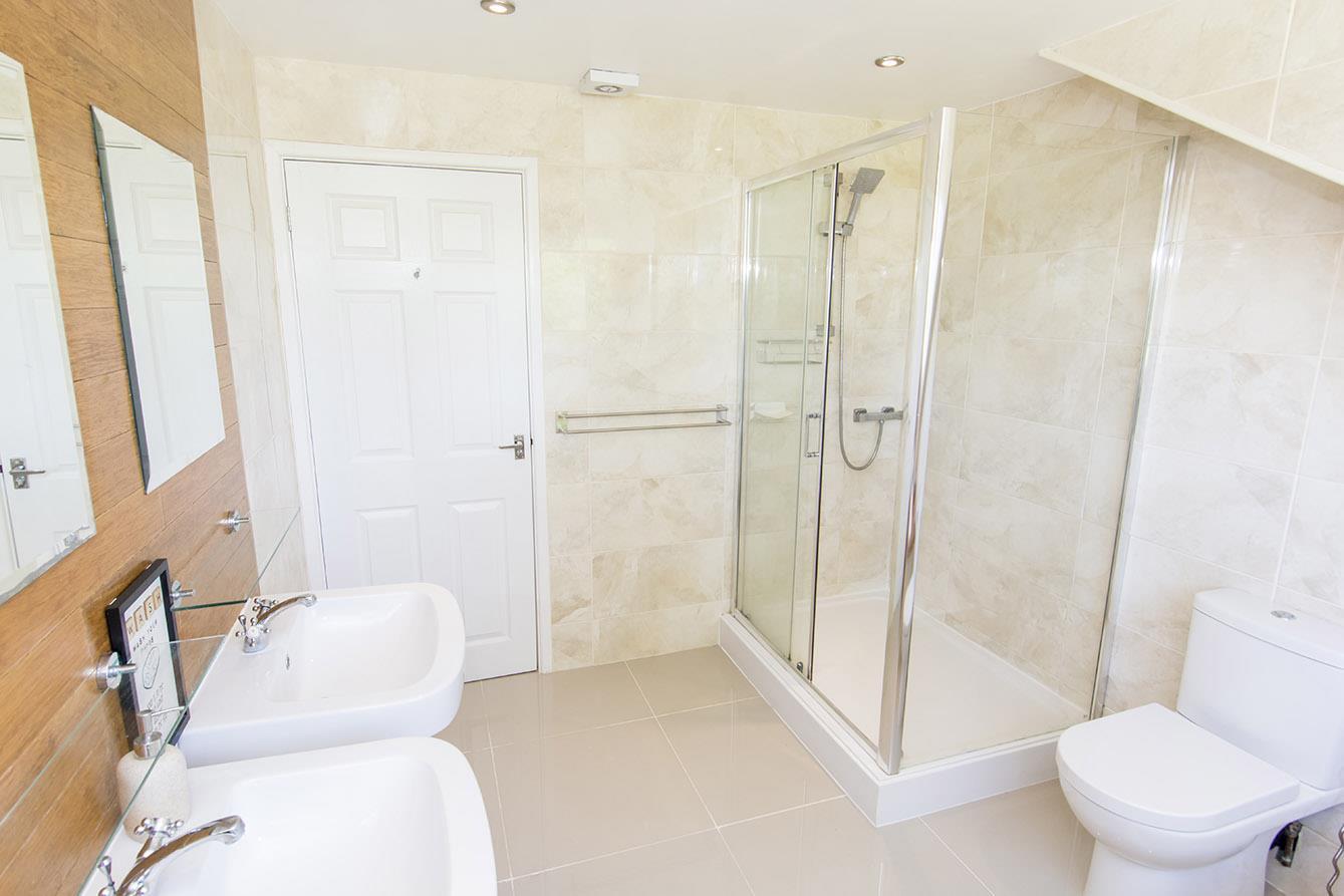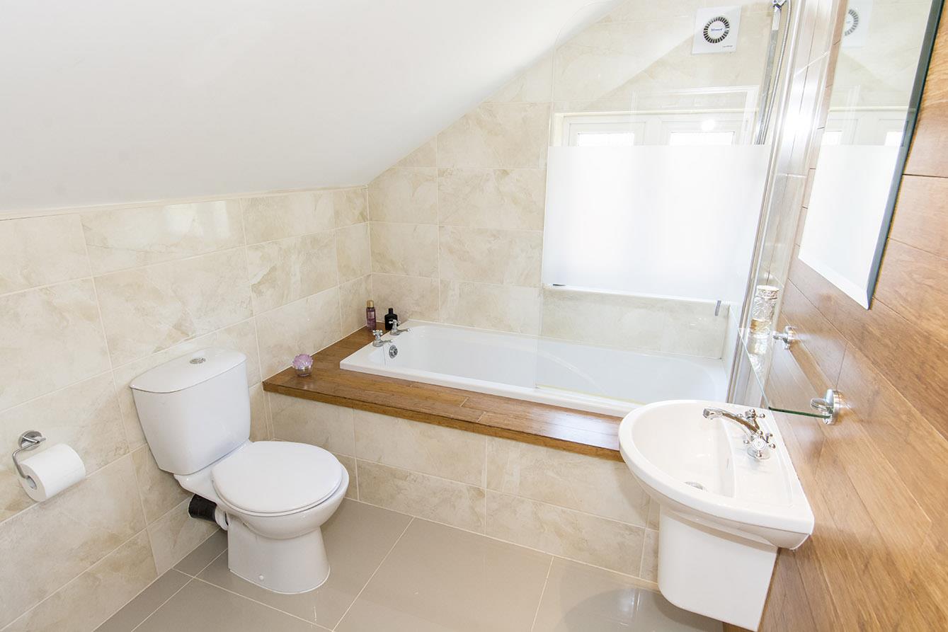 En-Suite Bathroom - Panelled bath with mains shower fitment over. Wash hand basin. Low level WC. Heated towel rail. Complementary tiled floor and walls. Opaque double glazed window.