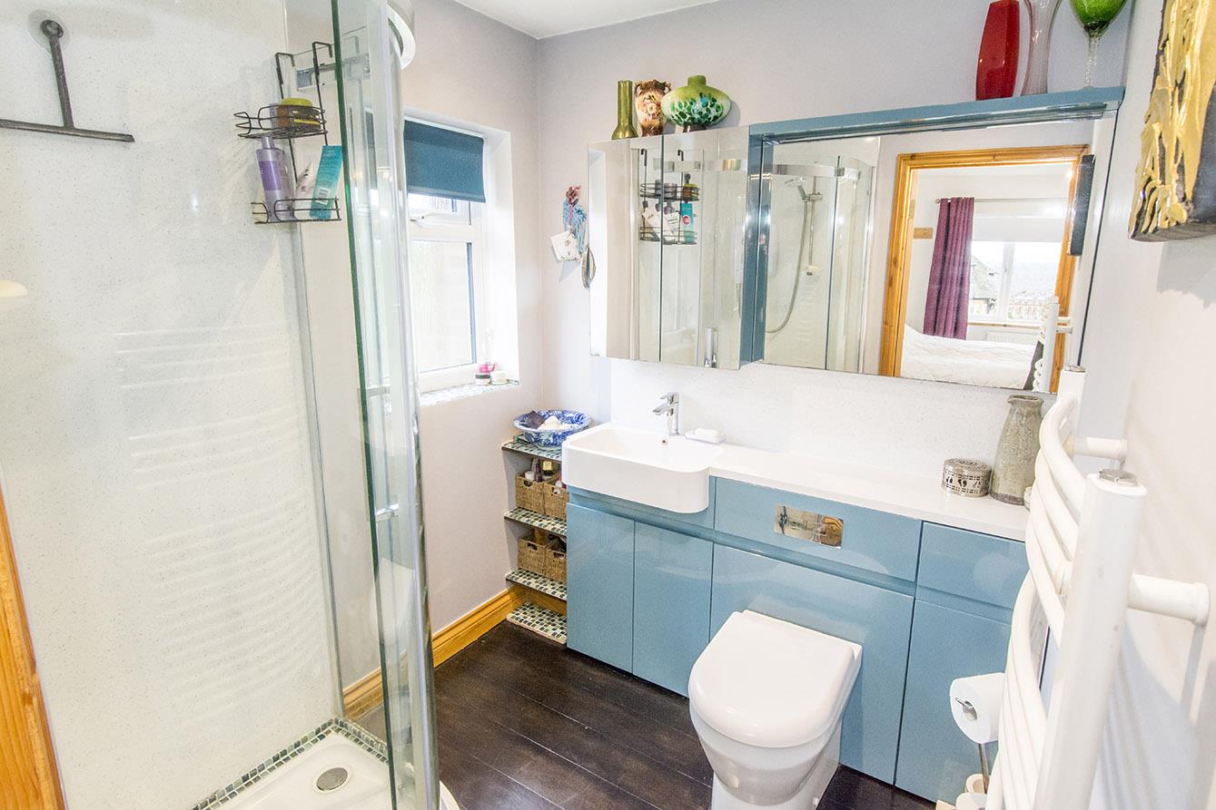 En-Suite - 2.01m x 1.91m (6'7 x 6'3) - Comprising: Corner shower enclosure with aqua boarding, low level WC and wash hand basin within a fitted vanity unit with mirrored cabinet over. UPVC double glazed window to side aspect. LED spotlights. Heated towel rail. Varnished wooden floorboards.