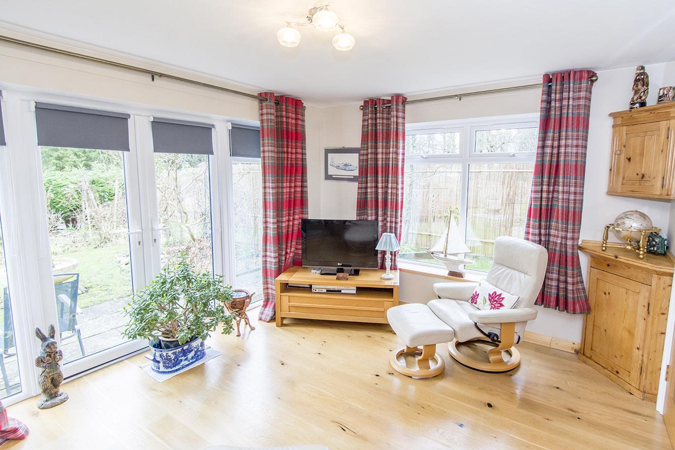 Study - 3.96m x 3.28m (13'0 x 10'9) - UPVC double glazed 'French' doors with full height double glazed side panels. UPVC double glazed picture window to side aspect. Engineered wooden flooring. Under floor heating.