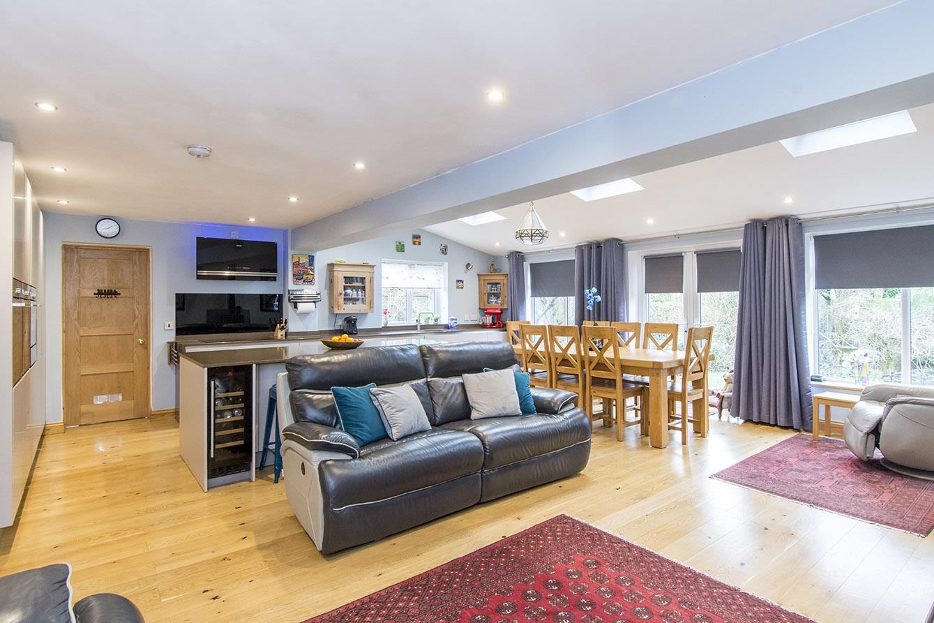 Dining Area - UPVC double glazed 'French' doors out to: Rear garden. UPVC double glazed picture windows to rear aspect. Vaulted ceiling with 3 x 'Velux' windows and LED spotlights. Engineered wooden flooring. Under floor heating.